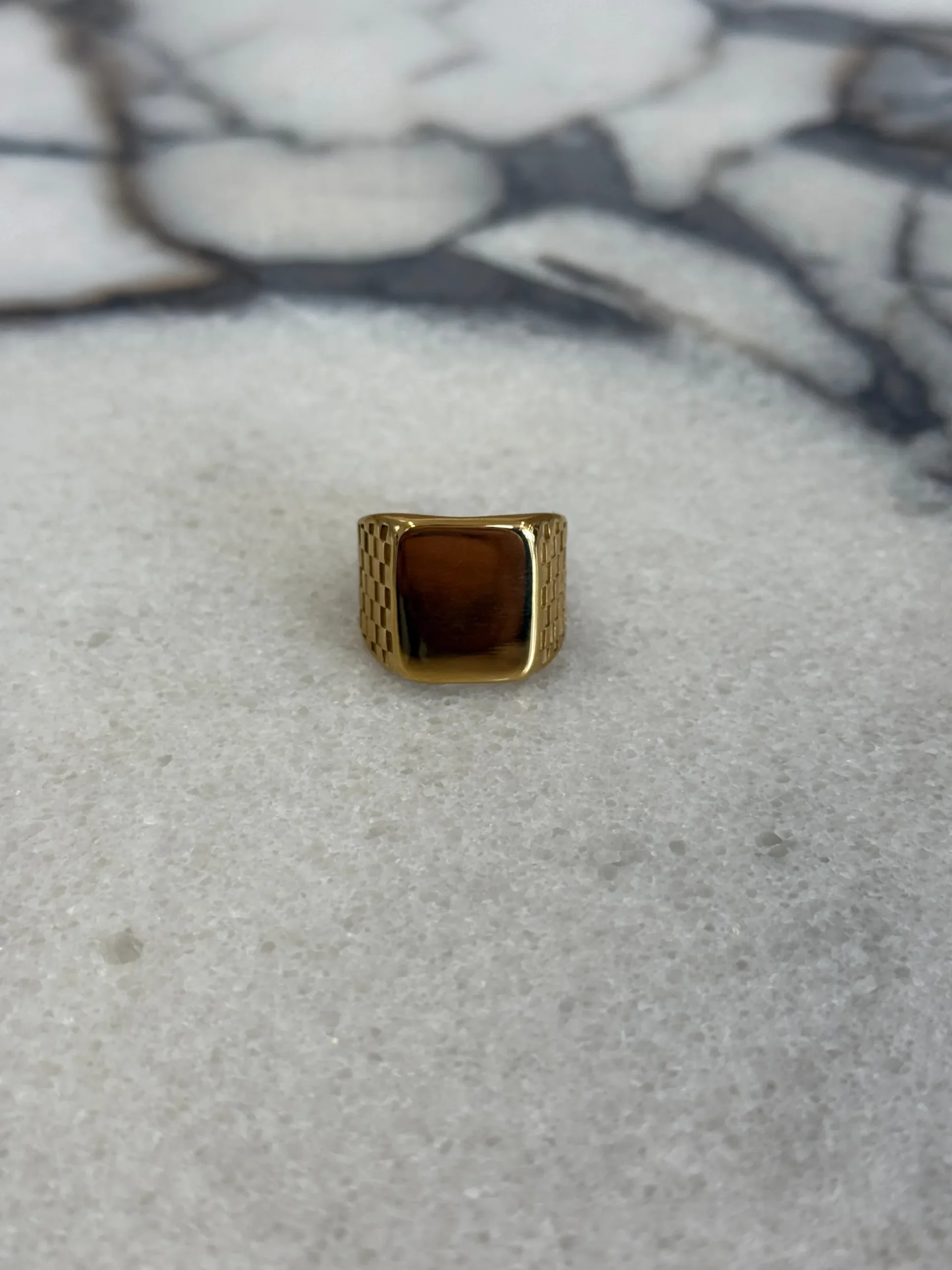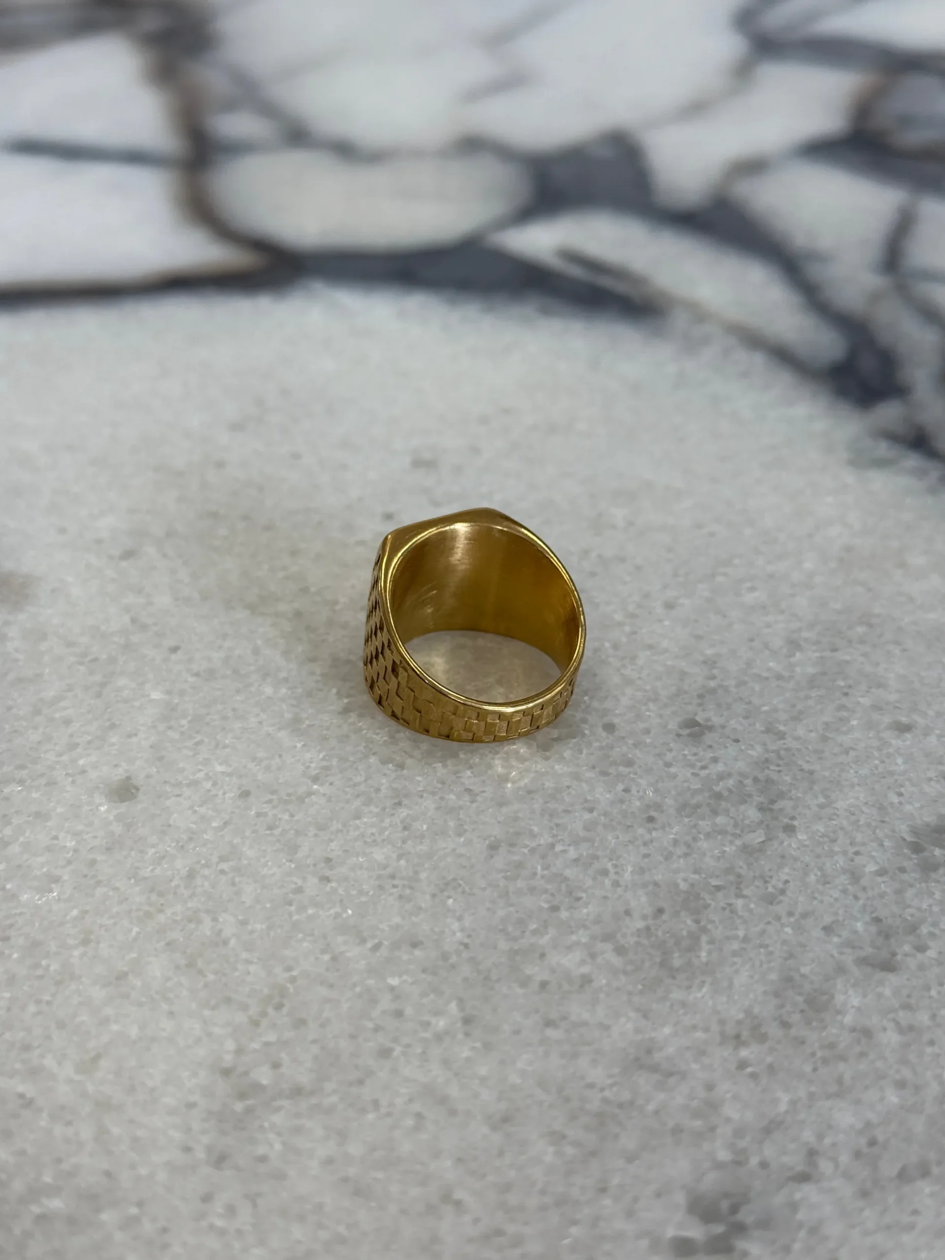 The Bold Signet Ring, crafted with a chunky silhouette and checkered detailing for a timeless accessory designed to elevate everyday looks.