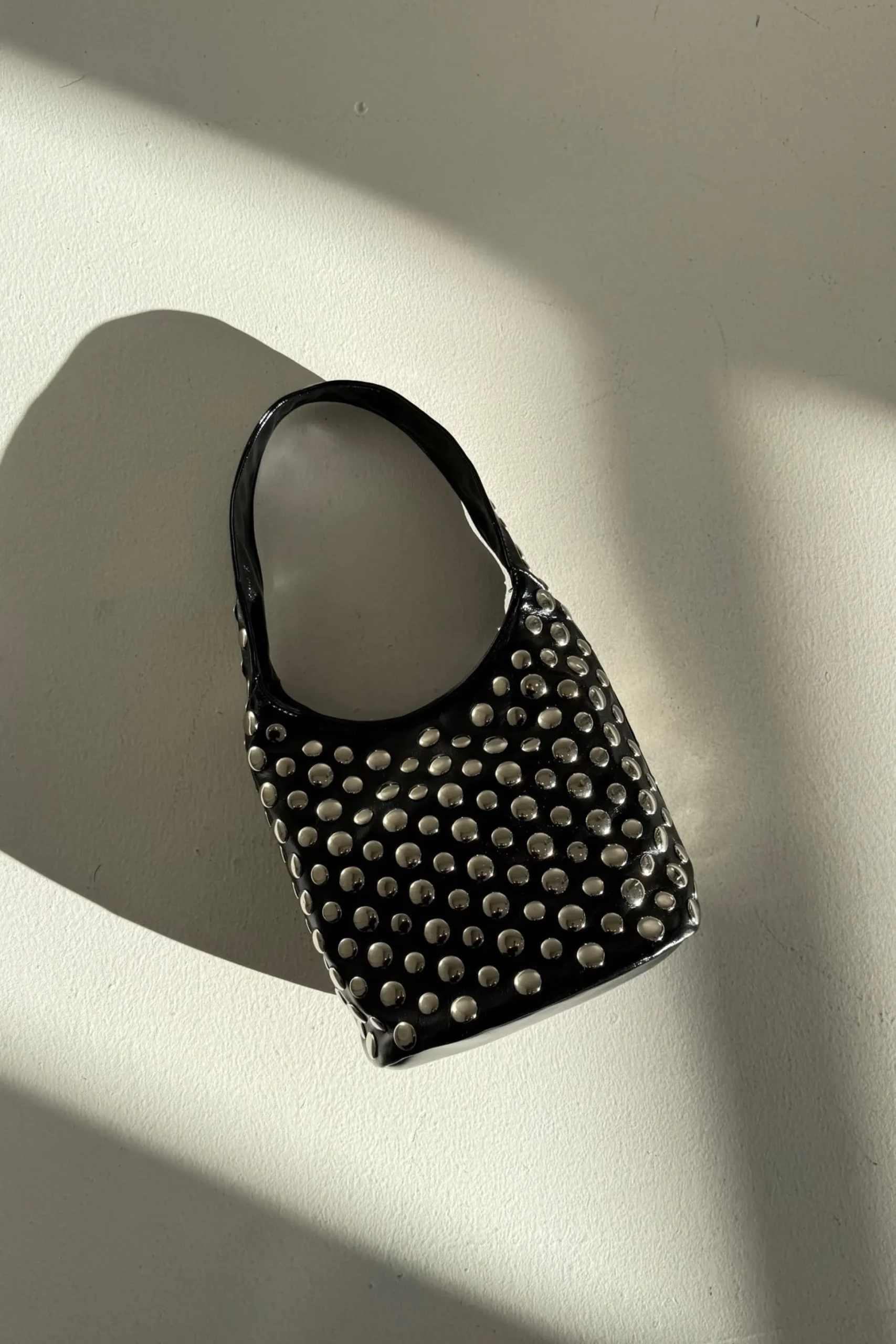 The Riley Studded Bag, Designed to turn heads. Adorned with silver studs all over, this bold accessory features a sleek bucket bag silhouette, a spacious main compartment, and a secure singular handle.