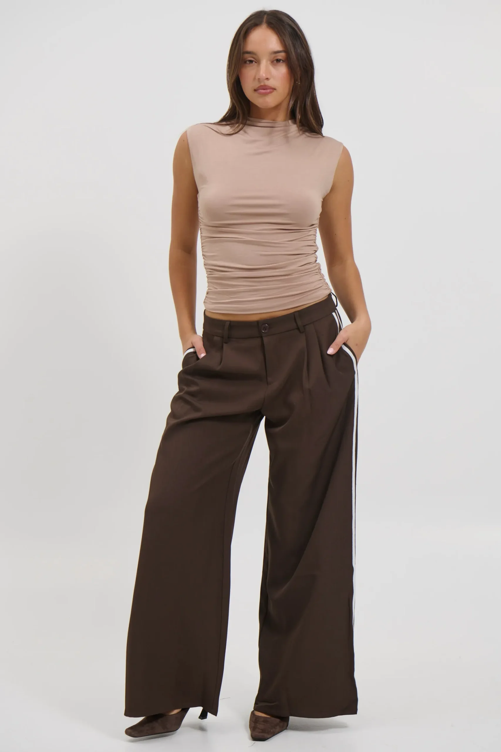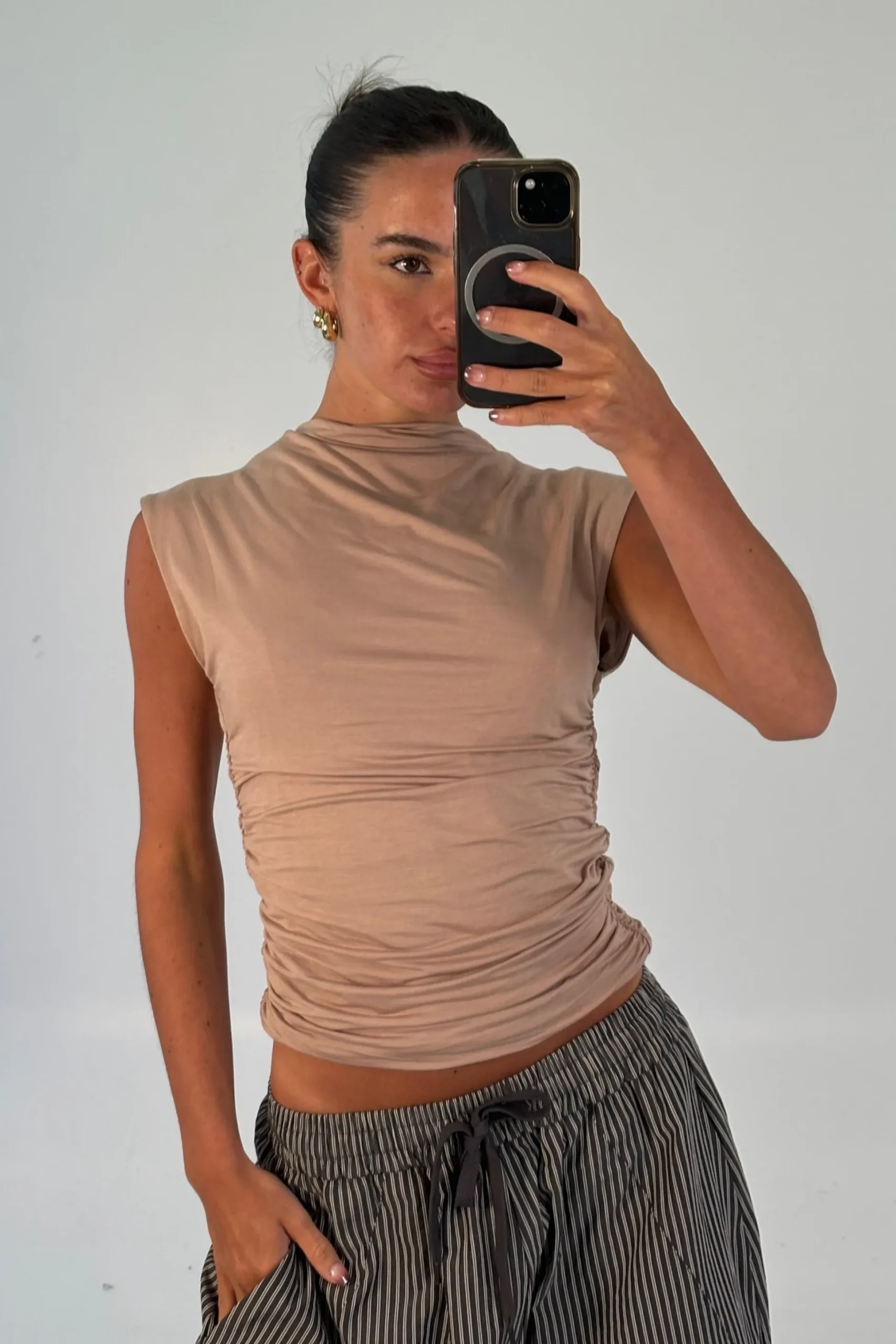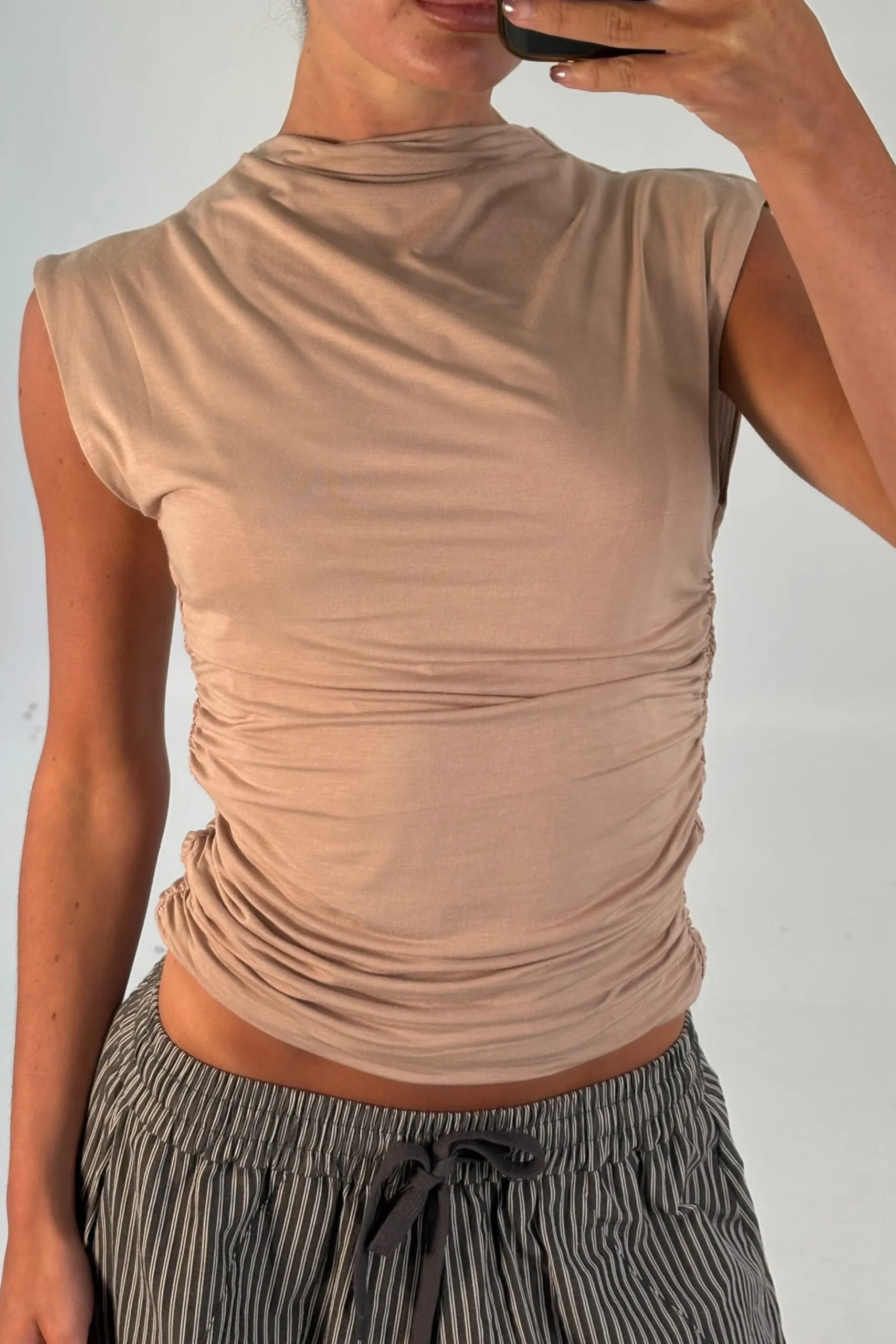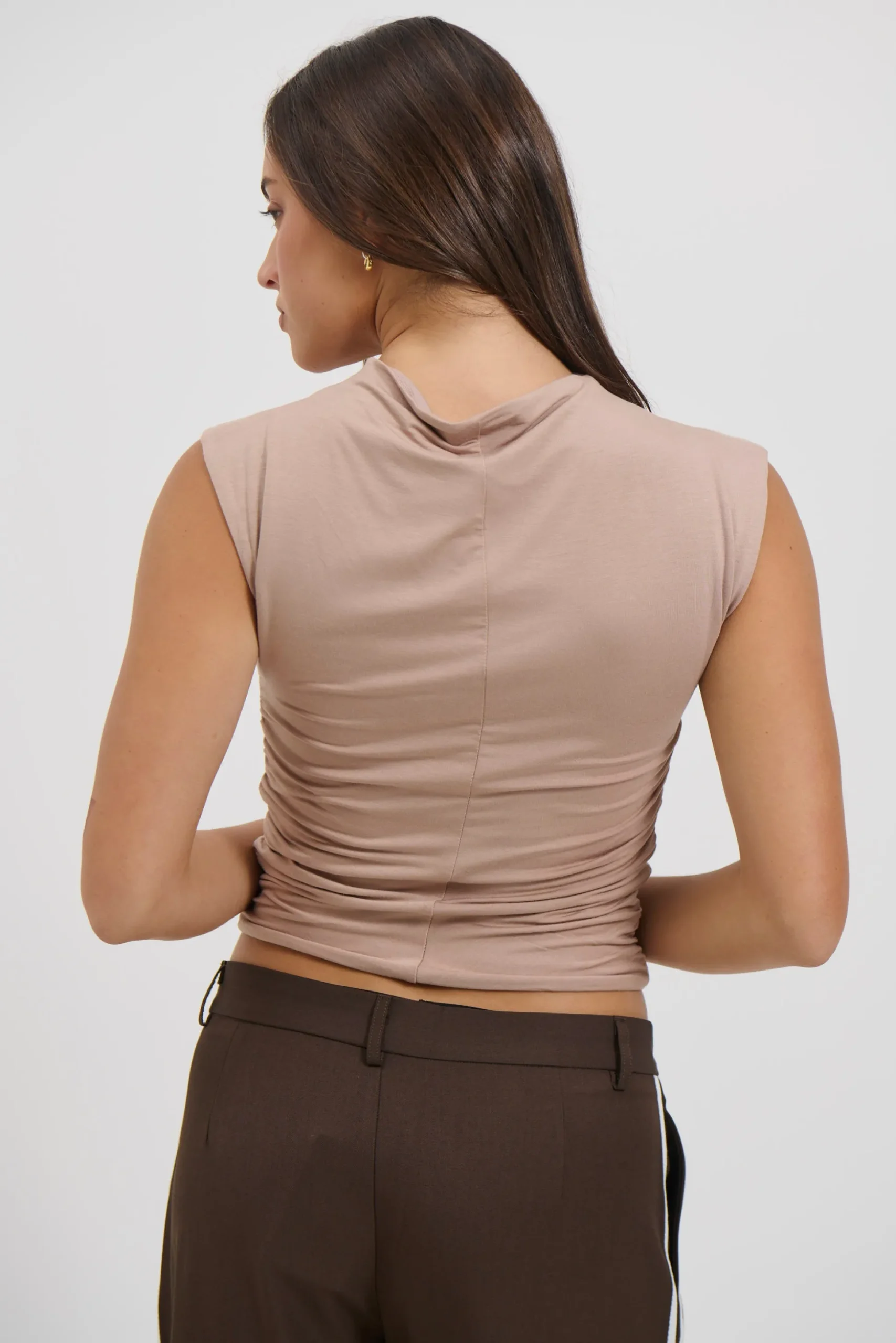 The Romen Top features a sleek sleeveless design with a chic turtleneck and ruched detailing. Made from a comfortable blend of 85% cotton and 15% polyester.