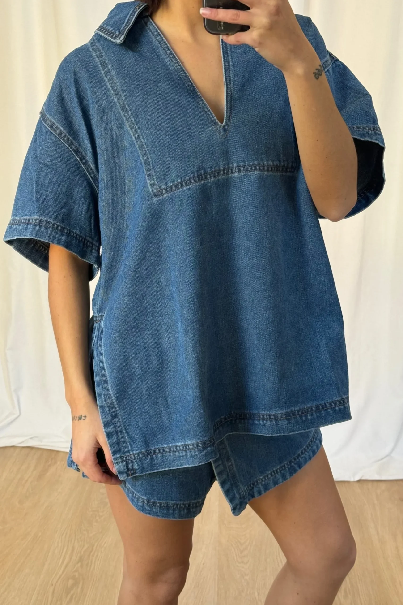 Meet the Rosemary Denim Shirt. Features a flattering deep V-neckline, this piece accentuates your collarbone while adding a touch of sophistication to any outfit. Crafted from 100% cotton, providing breathability and softness, making it perfect for any occasion. Pair with the Rosemary denim skort.