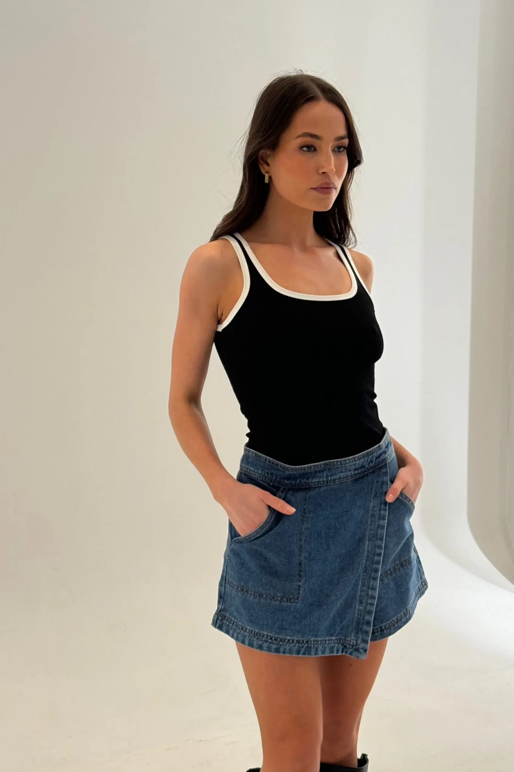 Meet the Rosemary Denim Skort. This skort combines the look of a skirt with the comfort of shorts. Featuring a wrap-front design and handy pockets, it’s perfect for casual outings.