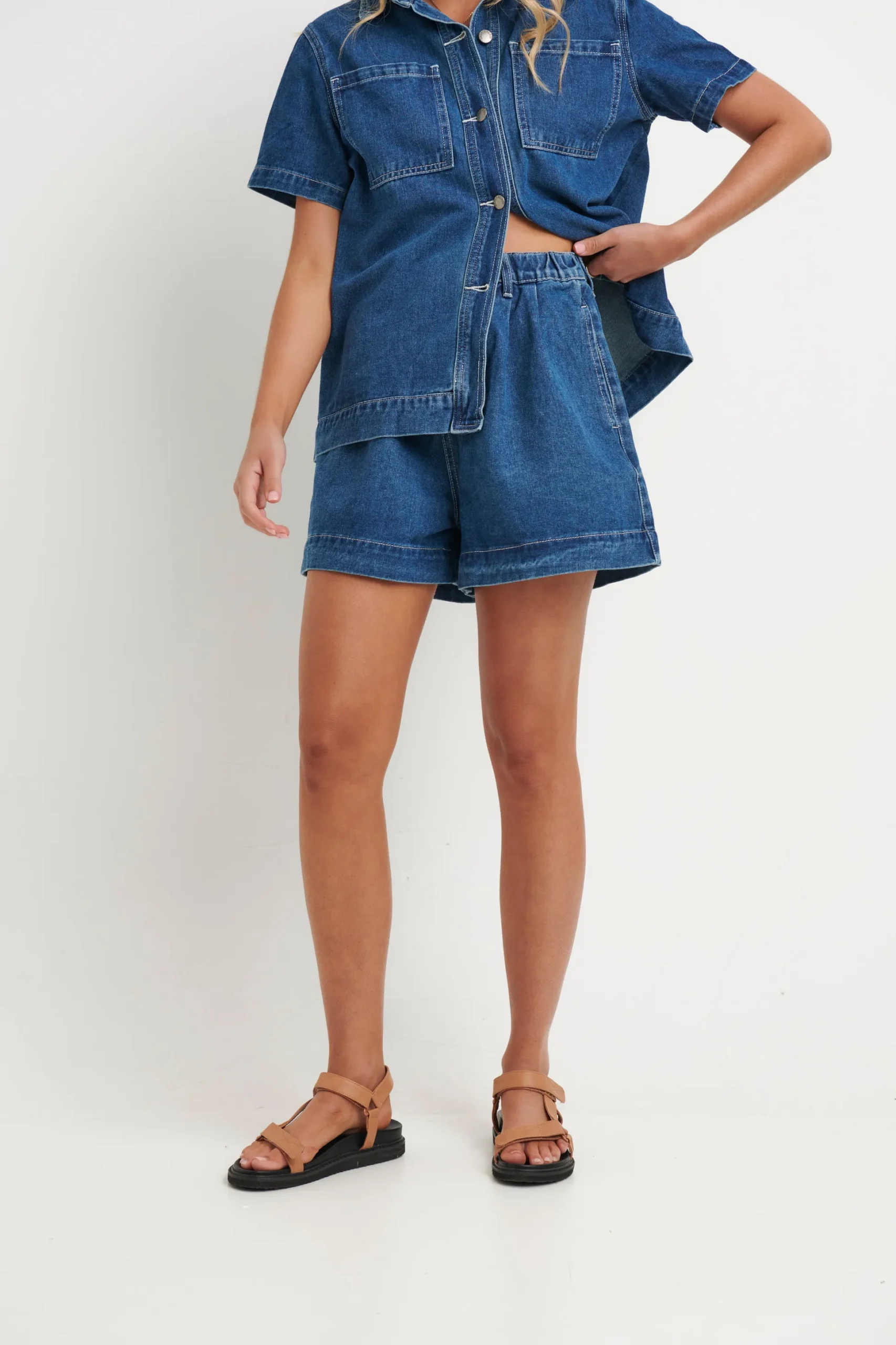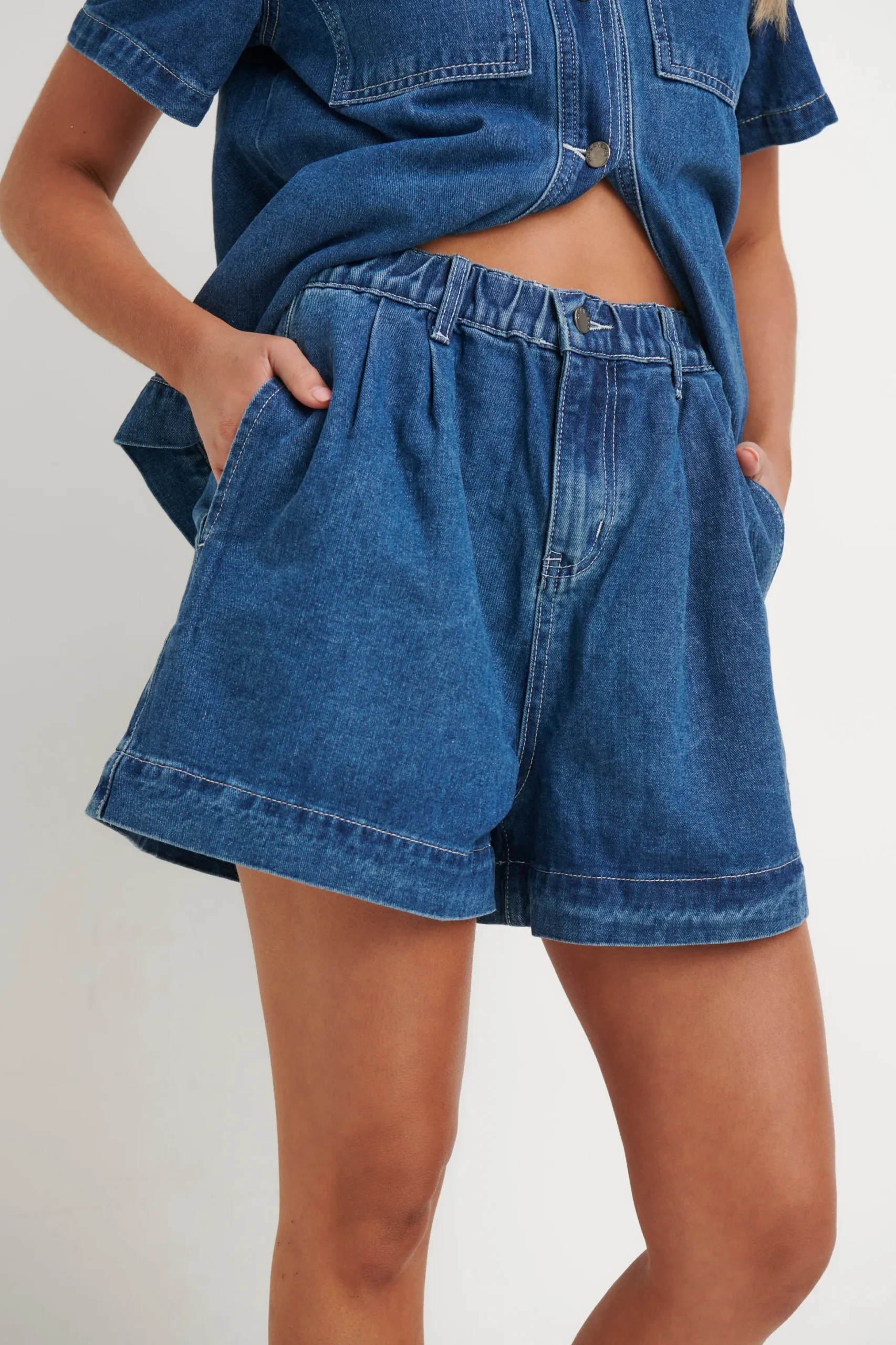 Our Sally Shorts—crafted for comfort and style with an elastic waist and zip fly. Featuring side pockets, belt loops, and a button closure, they’re perfect for sunny days. Made from 100% cotton for durability and breathability.