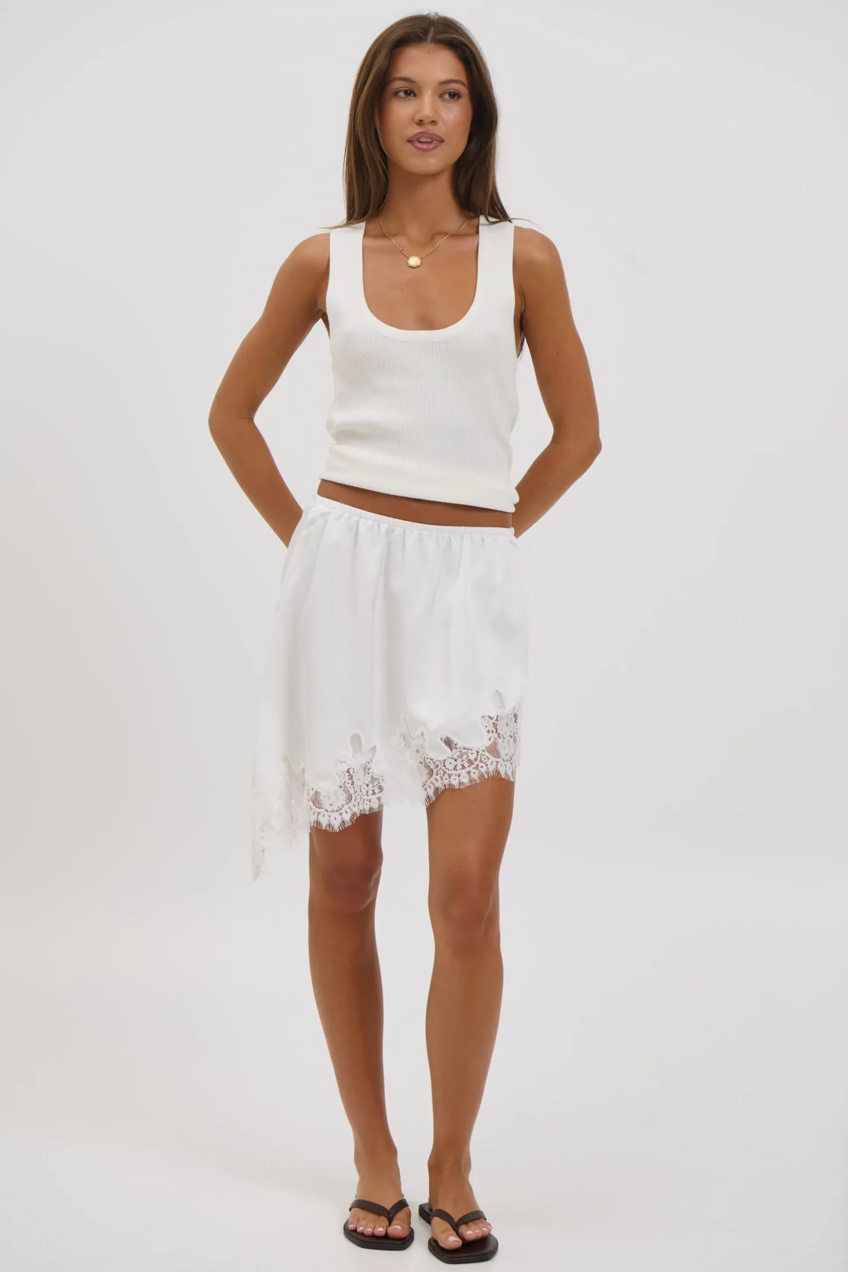 Meet the Sammi Lace Mini Skirt, Featuring a mini length with an asymmetric lace-trimmed hem, this skirt brings a delicate yet modern edge. Crafted from a silky-look fabric that drapes beautifully, it’s fully lined for comfort and coverage. Finished with an elasticated waistband for an easy, flattering fit.