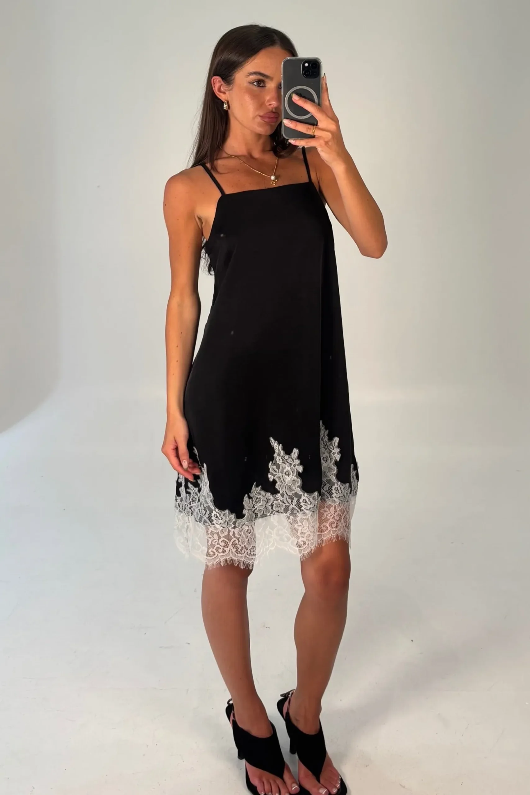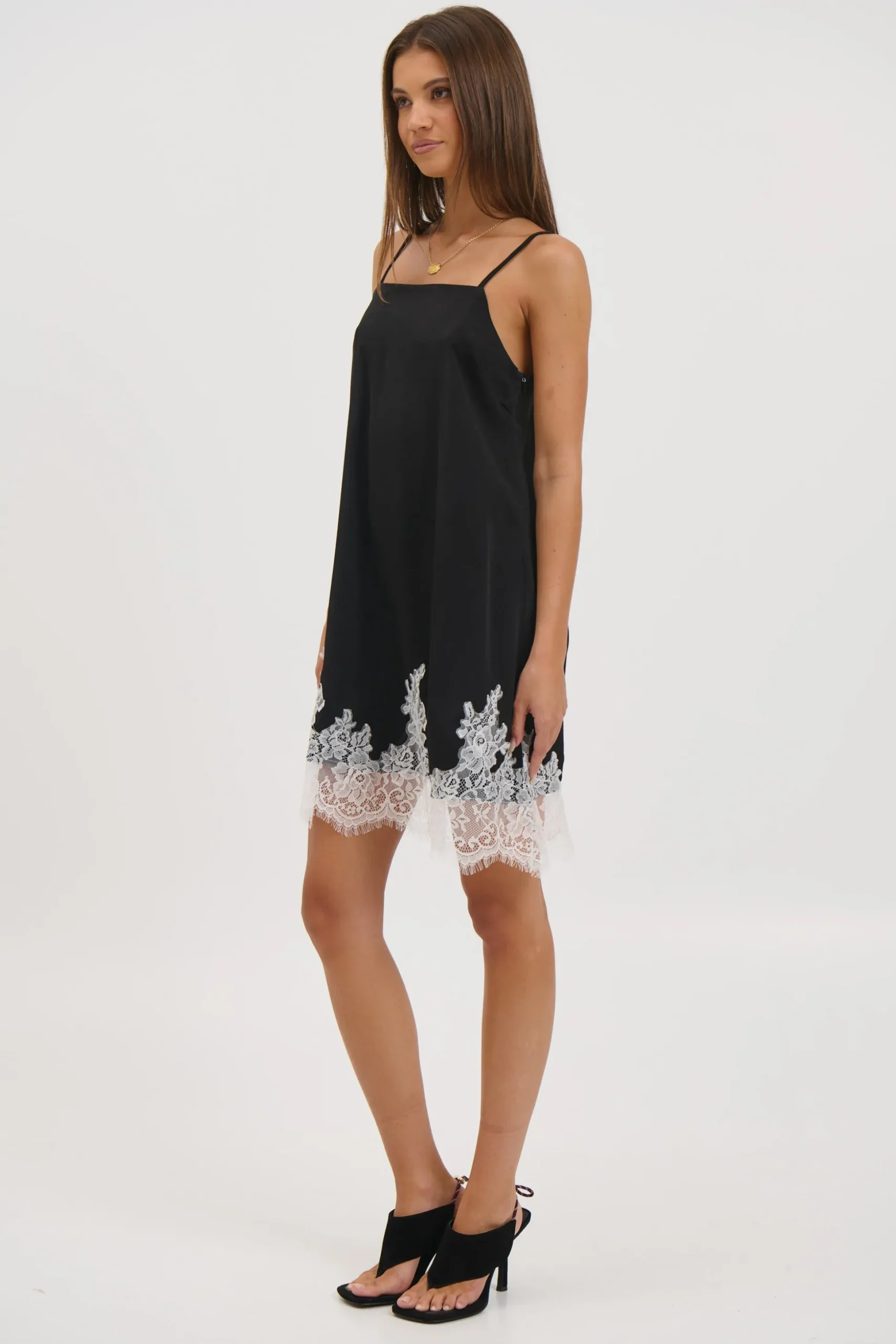 Meet the Sarita Mini Dress, features a relaxed, loose-fitting silhouette that drapes comfortably on the body. Designed with a clean square neckline for a contemporary touch, it’s finished with a delicate contrasting lace hem that adds softness and subtle detail.