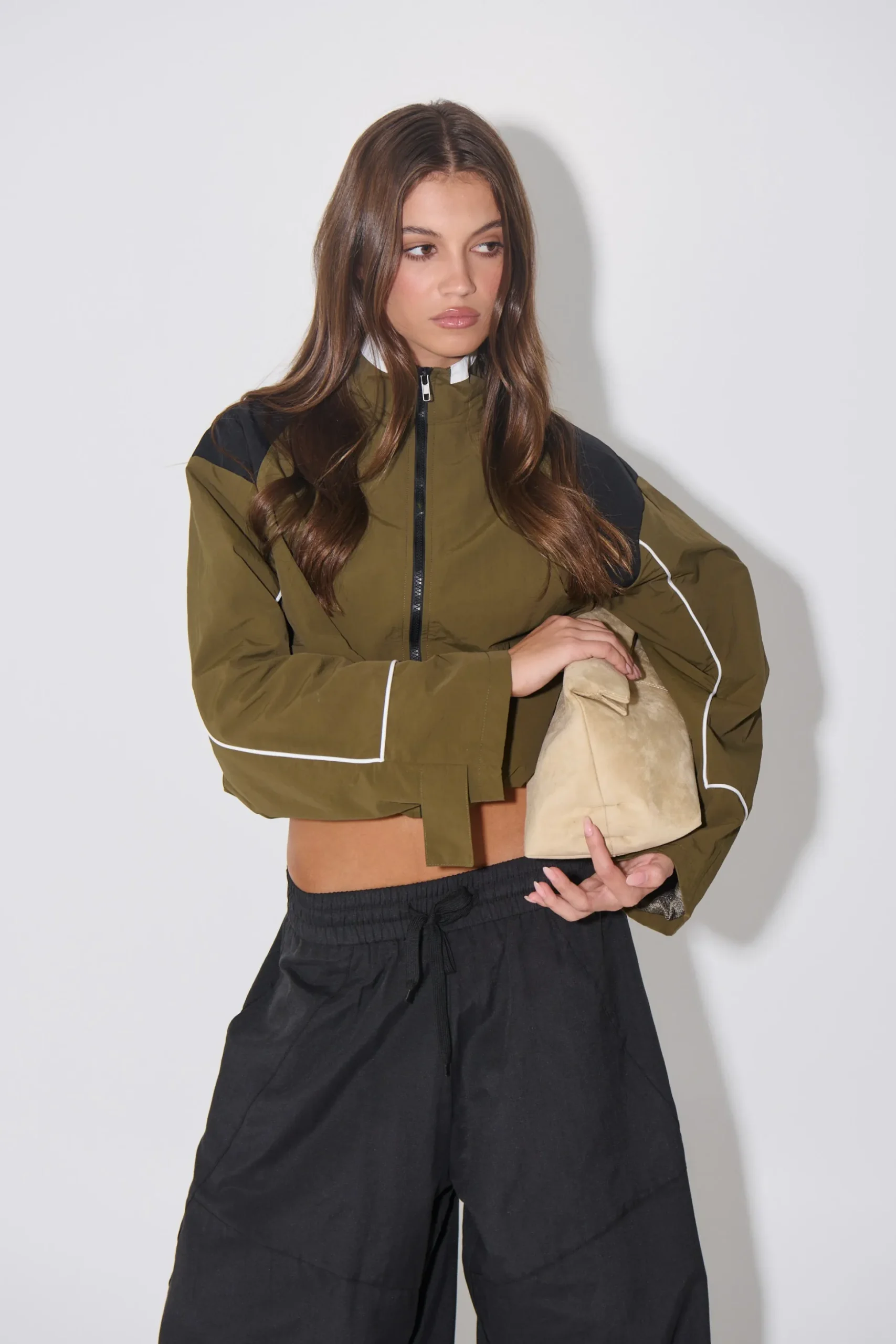 The Shoreline Windbreaker is designed to fit true to size, featuring a high neckline, zip closure with a storm flap, and an adjustable hem. Its slightly cropped silhouette is crafted entirely from 100% cotton for comfort and durability.