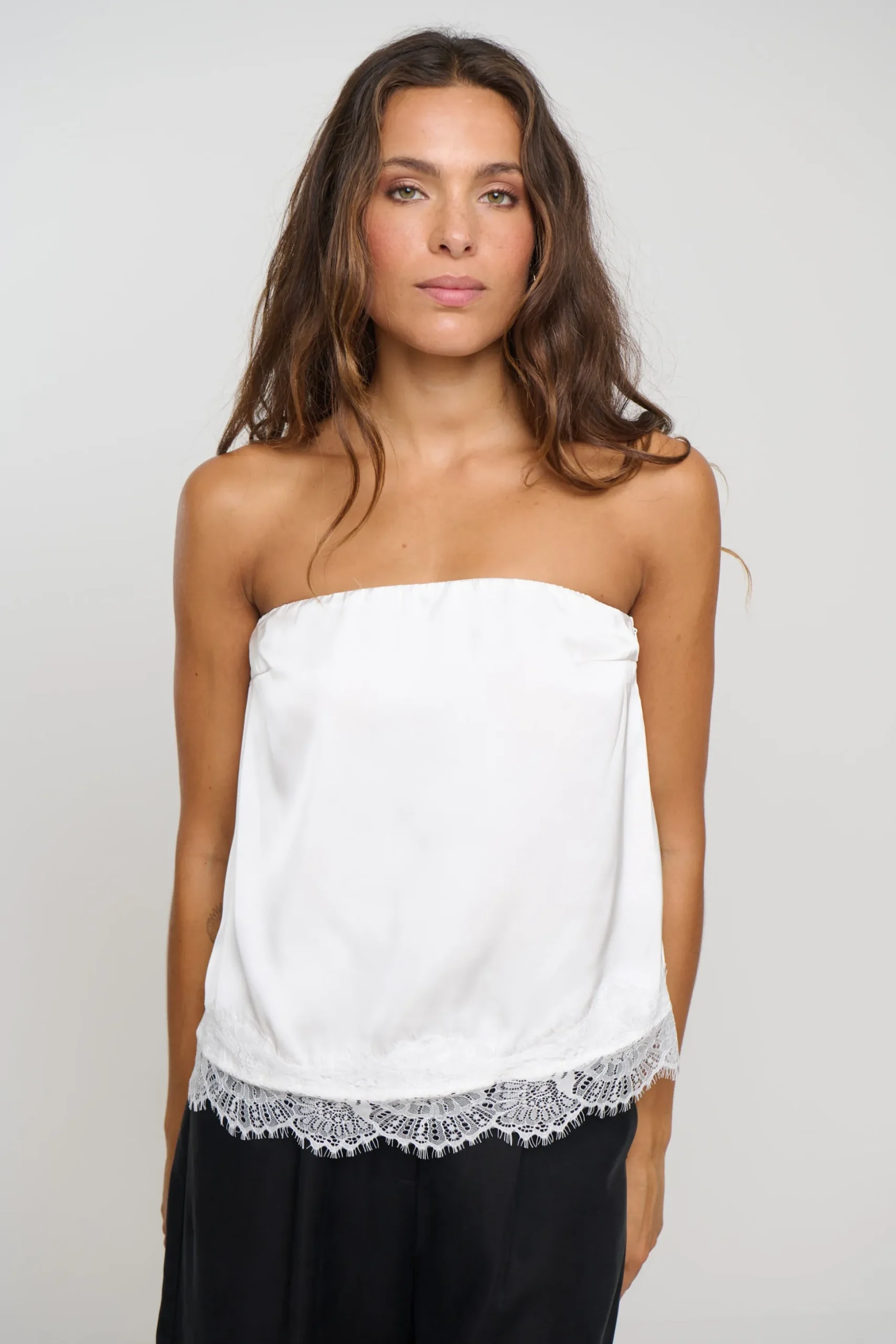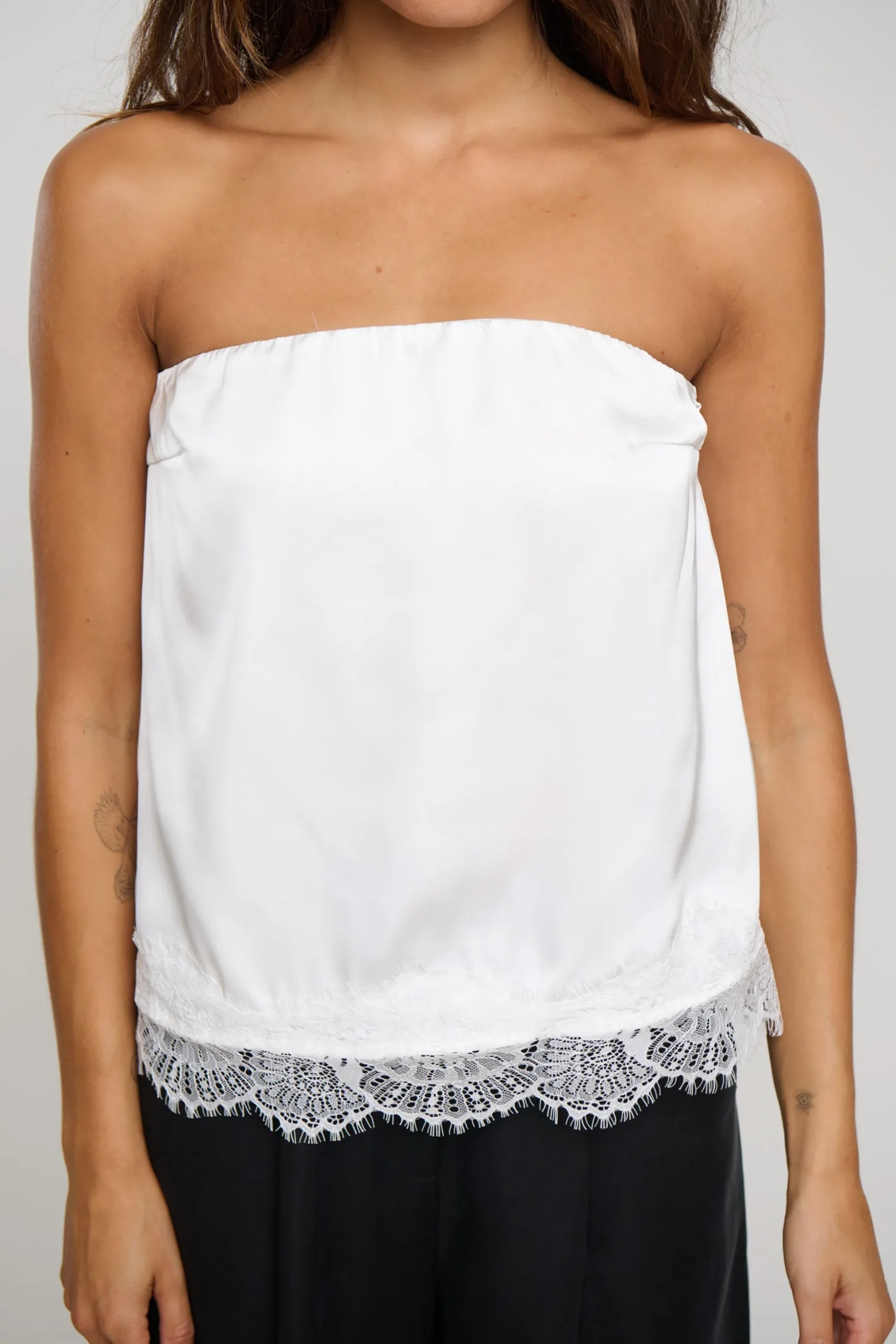 Meet the Stassie Strapless Top, features a sleek strapless neckline for a clean, modern look. The elasticated back band offers comfort and a secure fit, while the side zip closure ensures easy wear. Cut to a flattering cropped length, it’s finished with a delicate lace hemline that adds soft texture and feminine charm.
