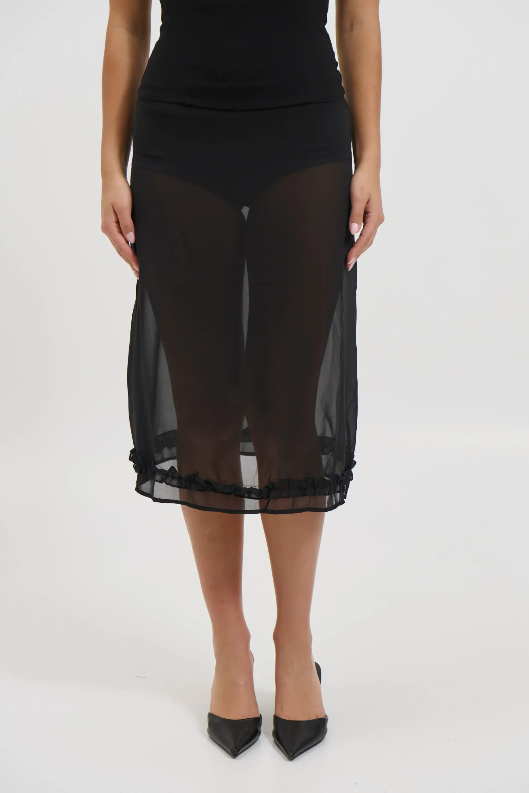 Meet the Tallulah Sheer Skirt, Featuring a midi length and crafted from sheer mesh with playful polka dots, this skirt is finished with a delicate ruffle hem and a discreet side zipper for easy wear. Elegant yet flirty, it’s perfect for layering or making a statement on its own.