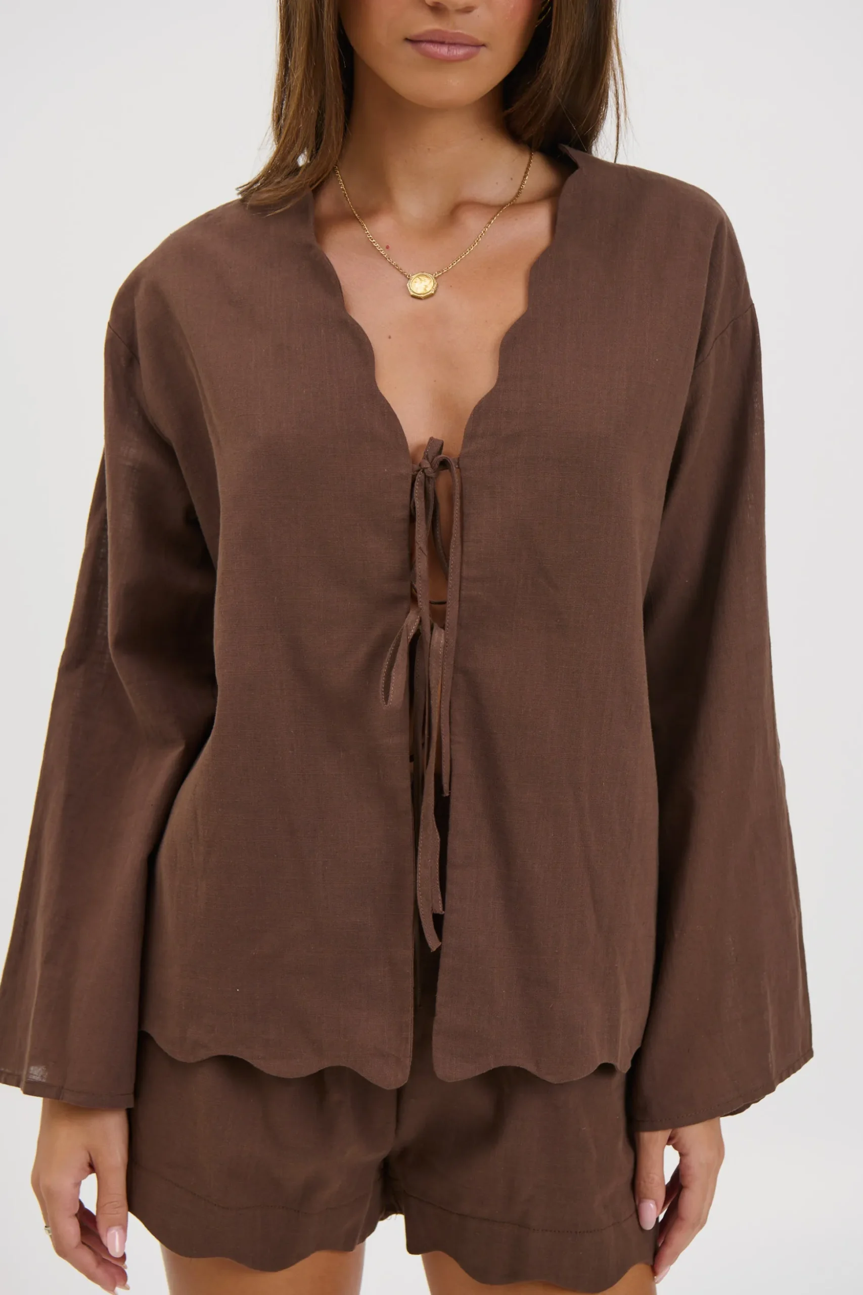 Meet the Tianna Scallop Set, The shorts feature a flattering scalloped hemline, practical side pockets, and an elasticated waistband for an easy, pull-on fit. Paired with a coordinating long sleeve shirt, the look is finished with a delicate tie-up front and matching scalloped hemline for a soft, romantic touch.