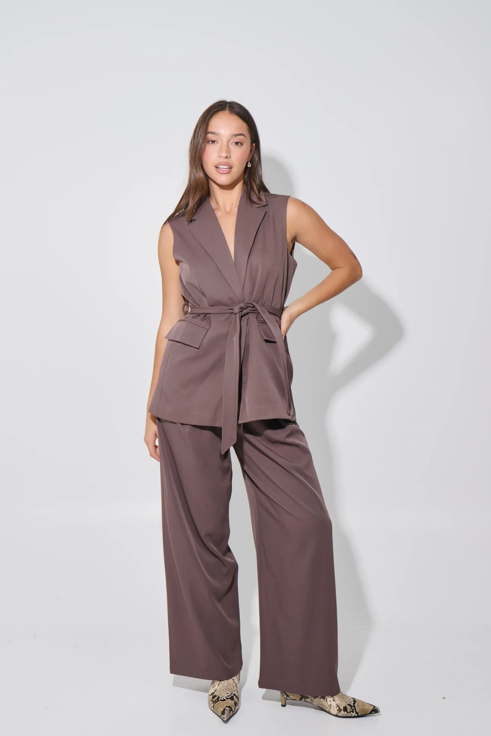 Meet the Vance Sleeveless Blazer, Featuring a tailored blazer-inspired design, this sleeveless top is complete with a sharp collar, button front closure, and a matching waist belt to cinch the silhouette. A polished yet modern piece. Pair with the Vance Pants for a sophisticated look.