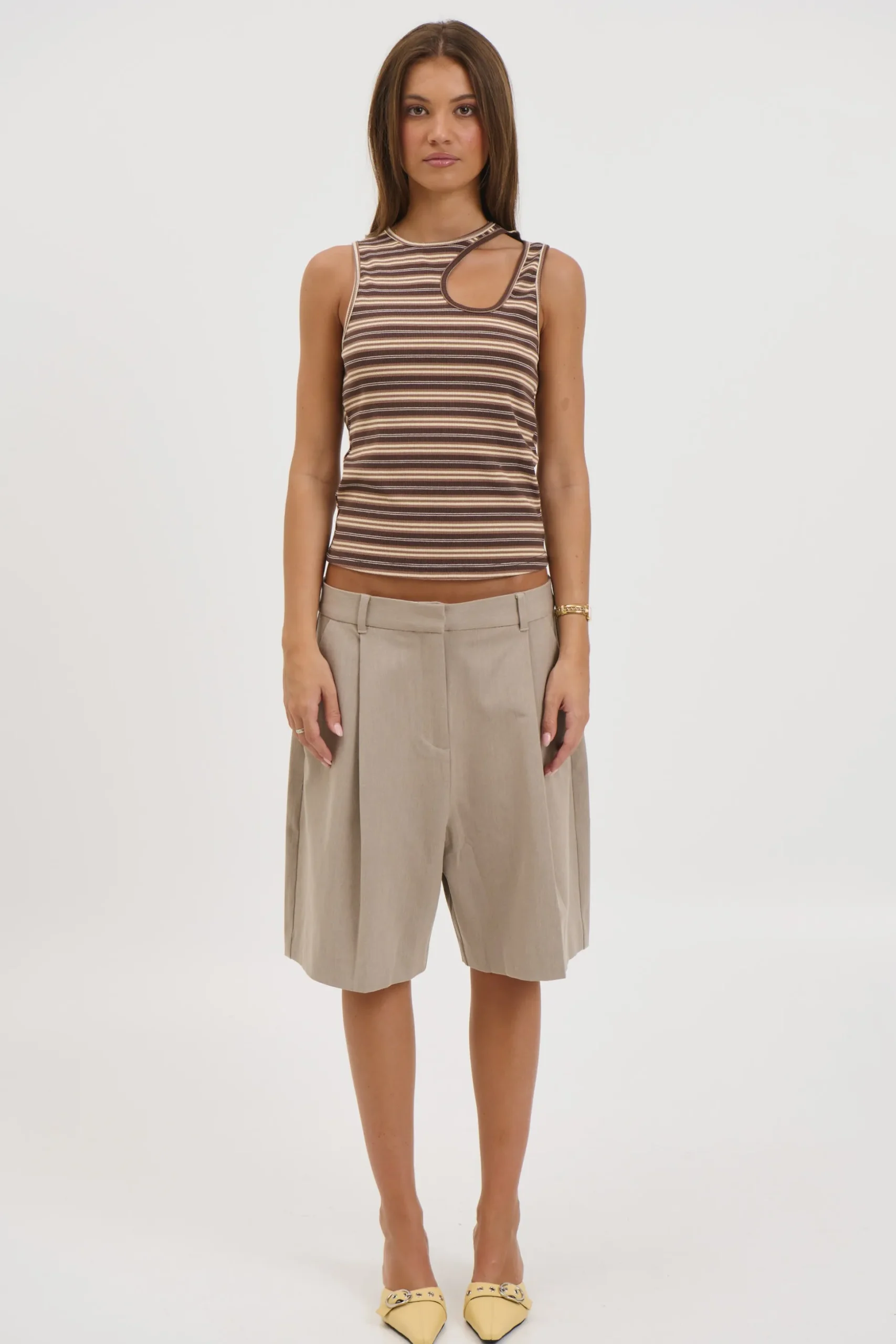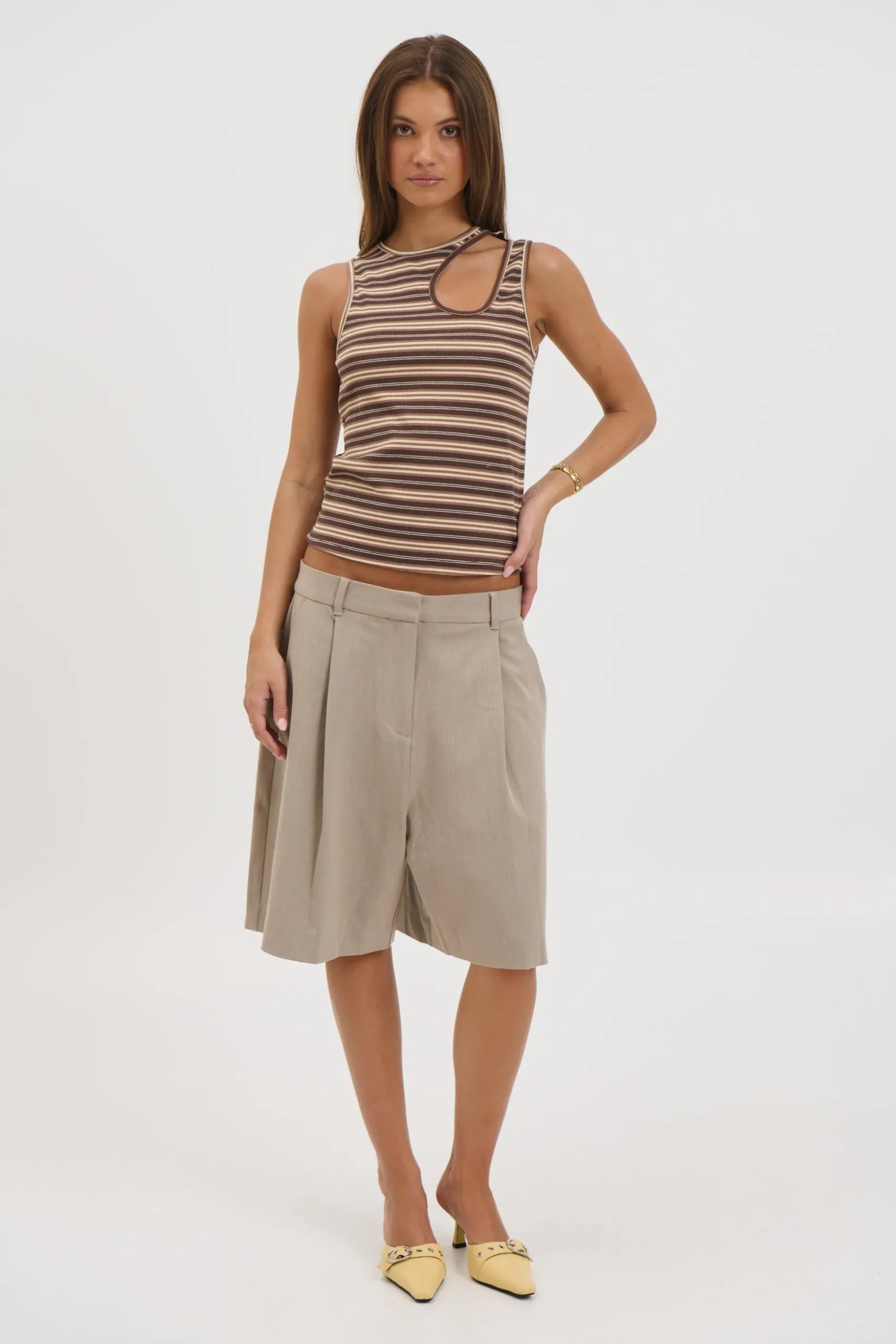 Meet the Veronika Tank, Featuring a contemporary ribbed tank crafted for effortless style, this top showcases a high neckline and a chic keyhole shoulder cutout.