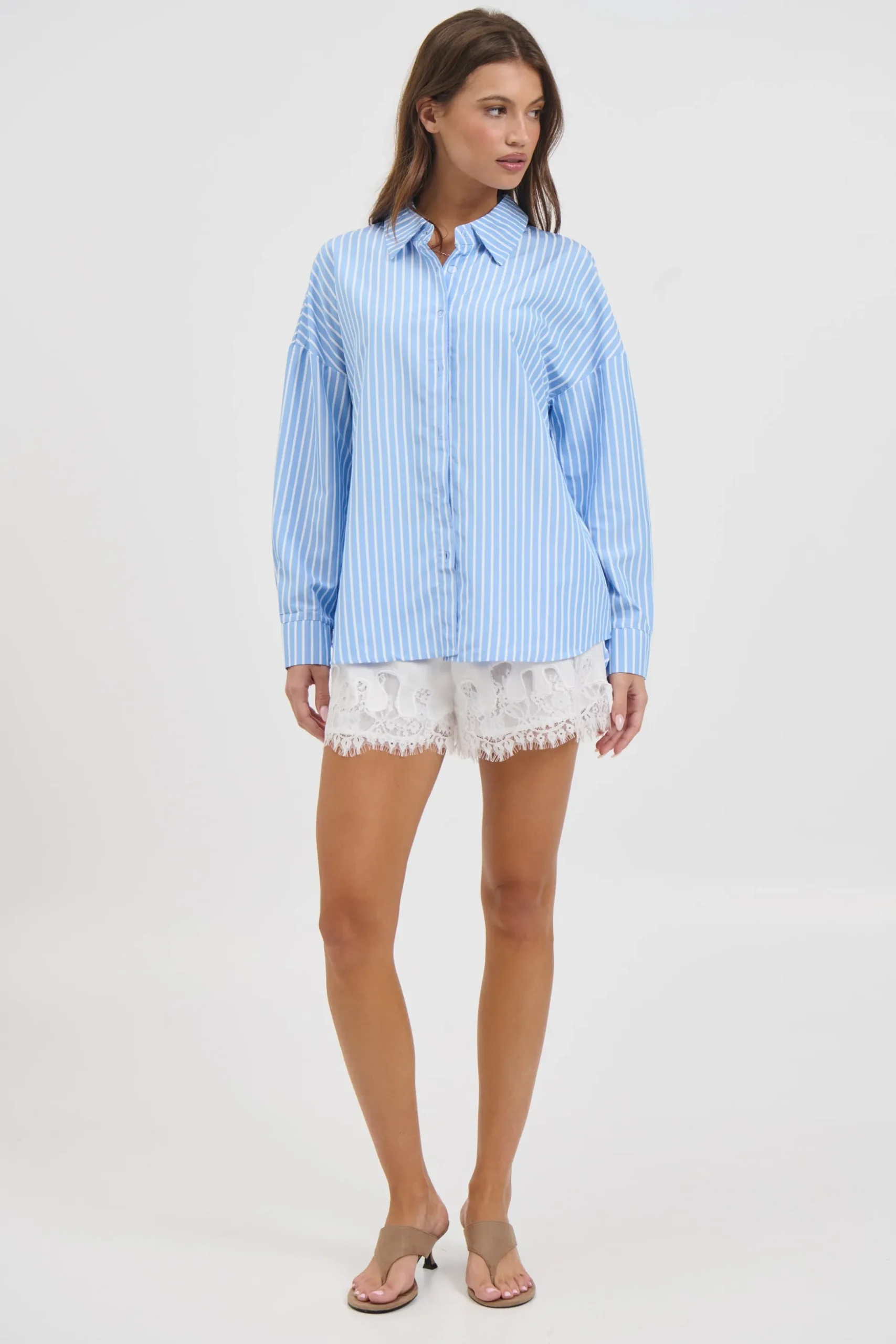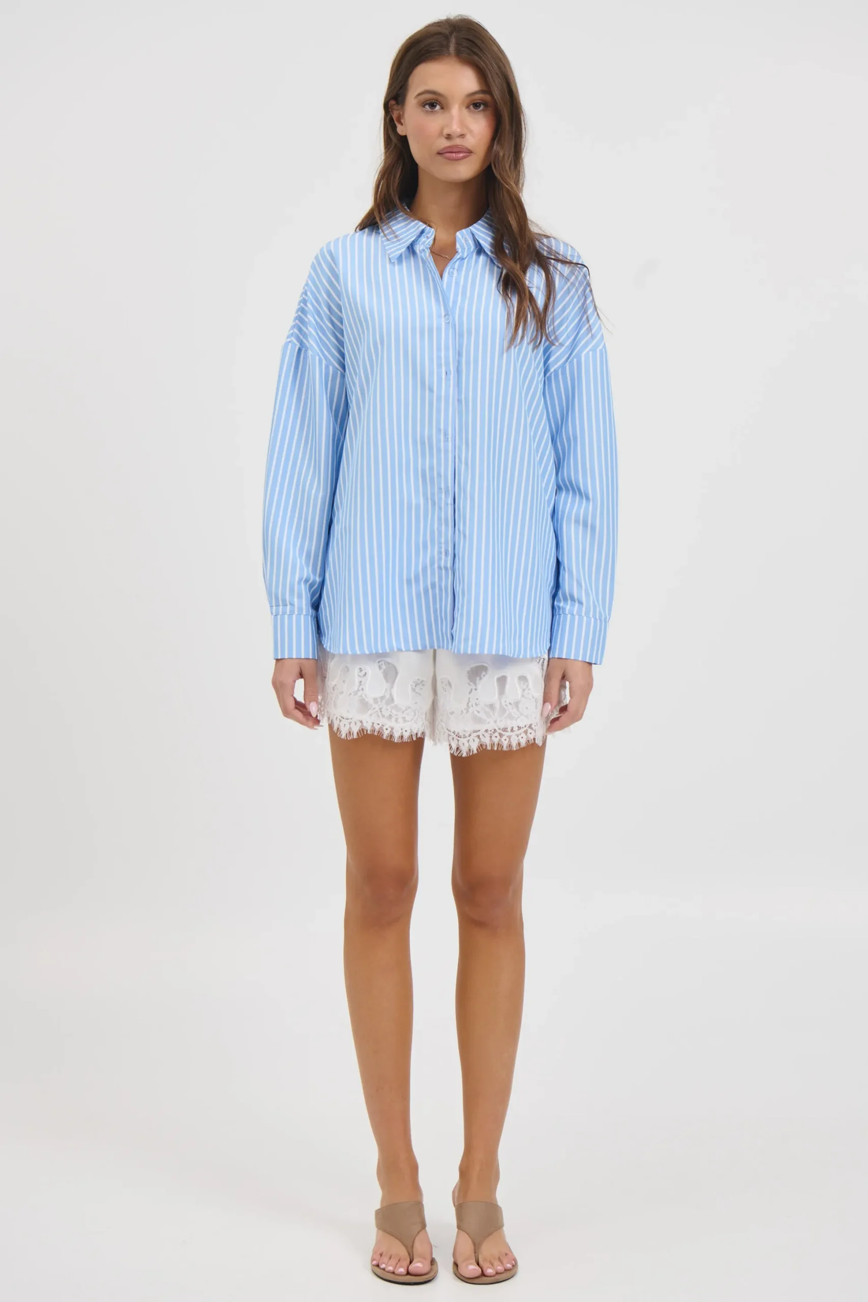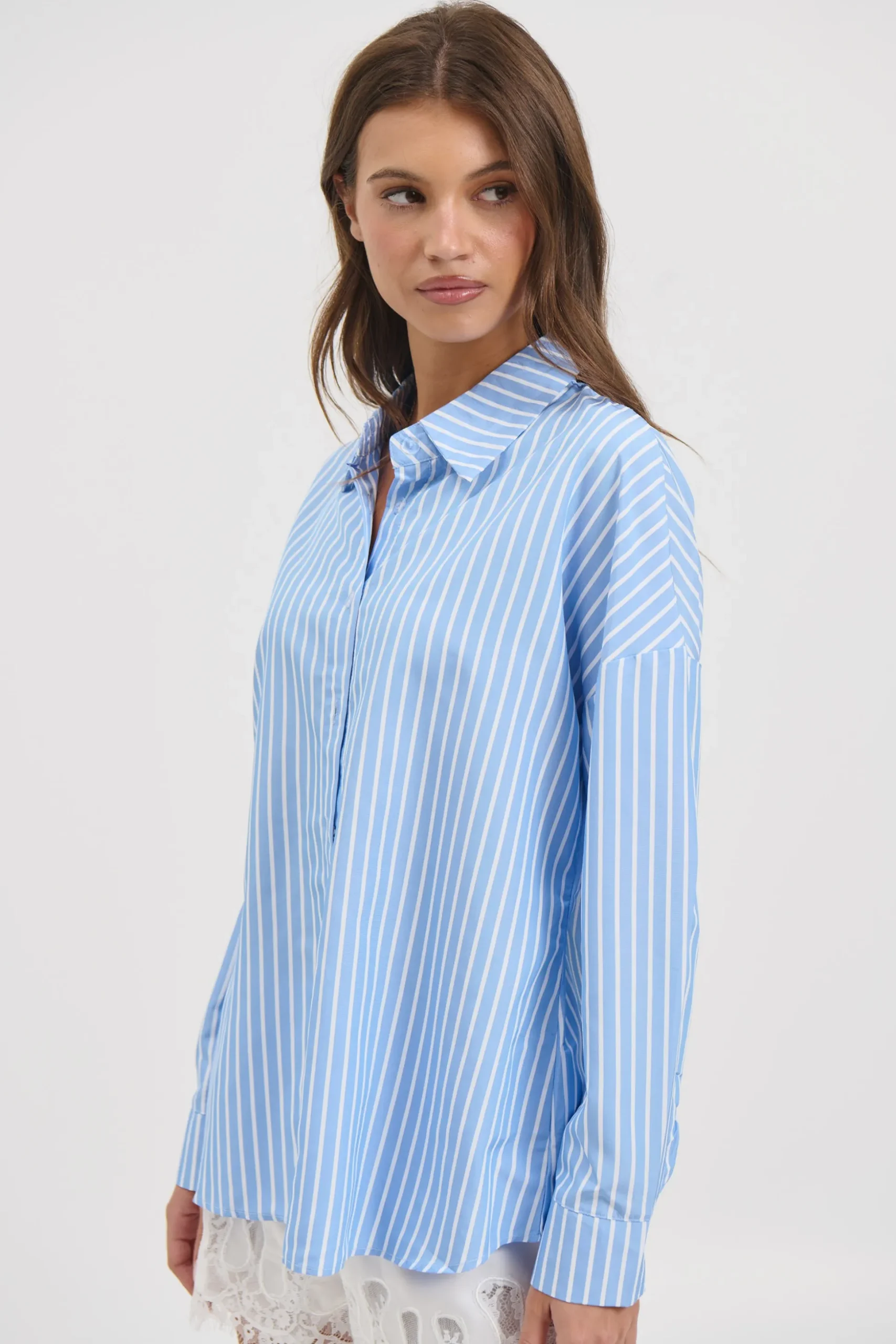 Meet the Victoria Shirt, Featuring a long sleeve shirt with a slightly oversize fit, this piece combines classic tailoring with a relaxed silhouette. The button-down front and crisp collar create a timeless look, while the subtle stripes add a touch of effortless sophistication.