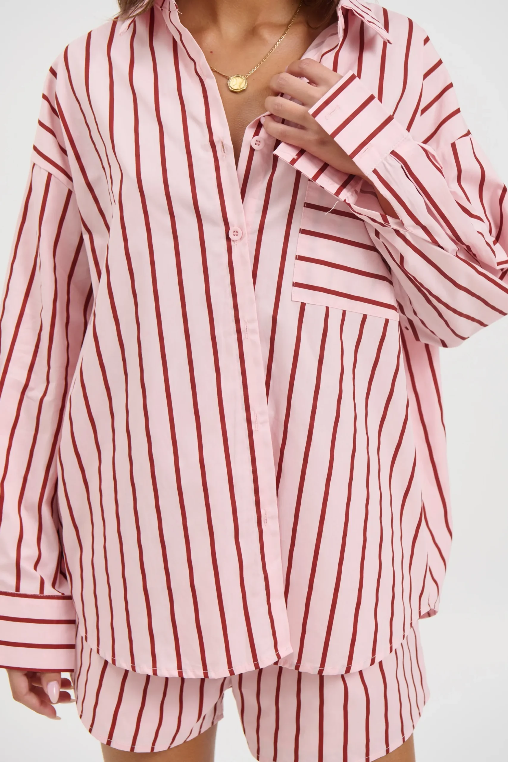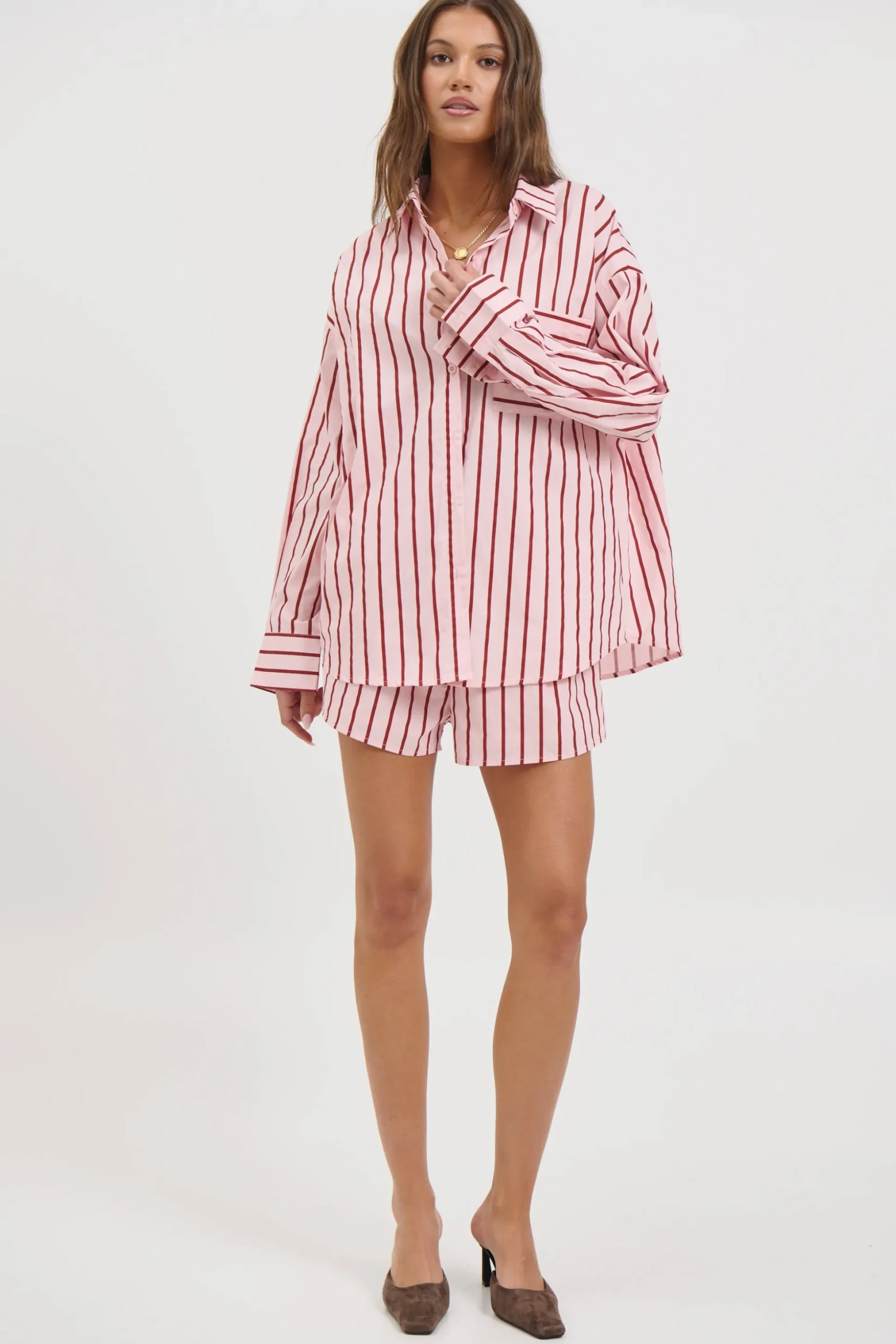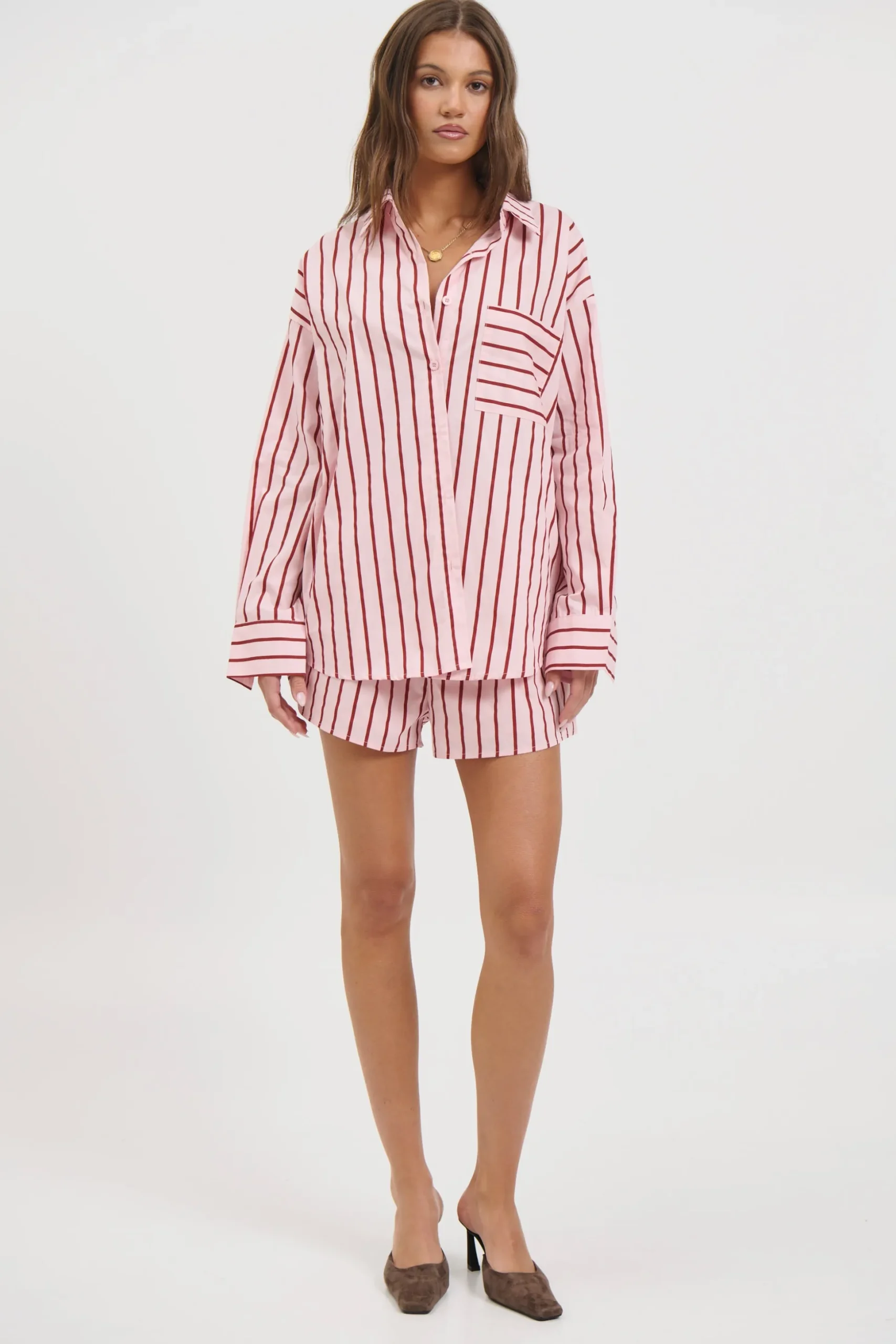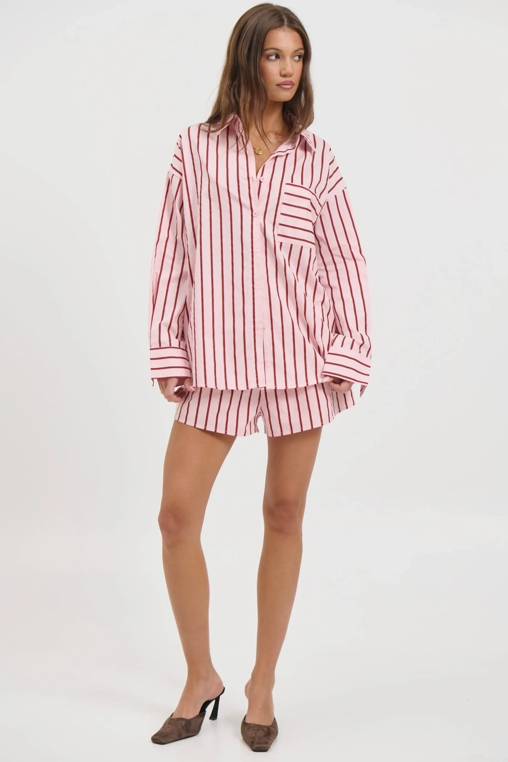 Meet the Wilson Set, Effortless and relaxed, this striped lounge set is the perfect blend of comfort and style. Featuring an oversized button down shirt with a collared neckline, dropped shoulders, and a front pocket detail, paired with matching relaxed shorts.