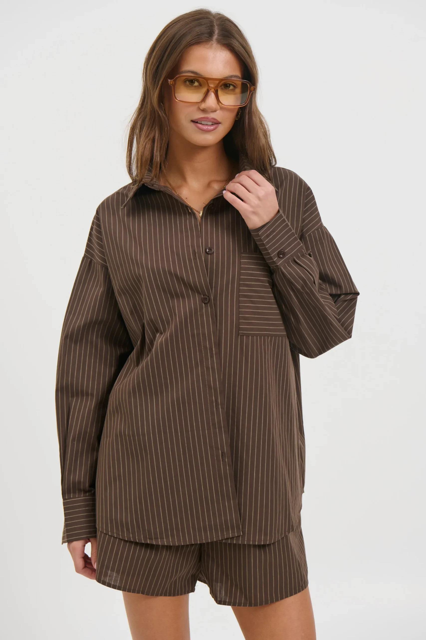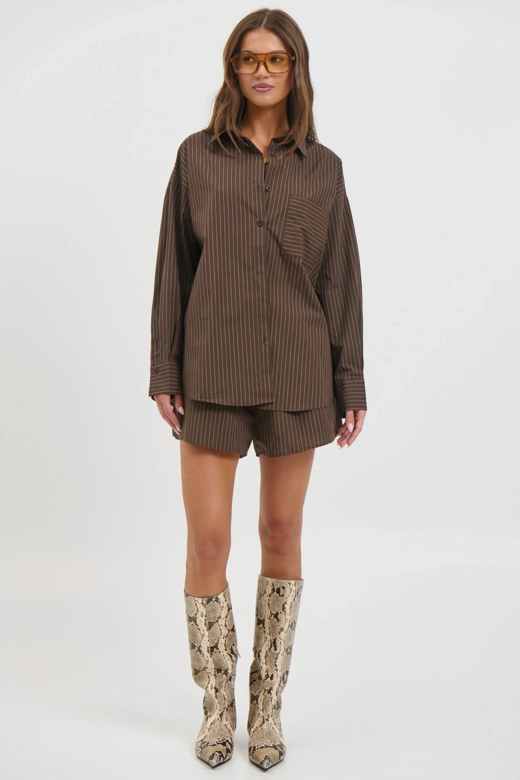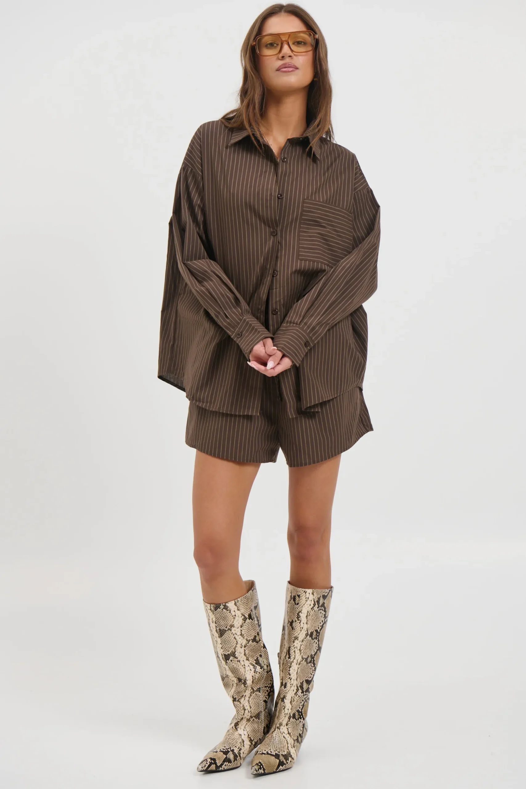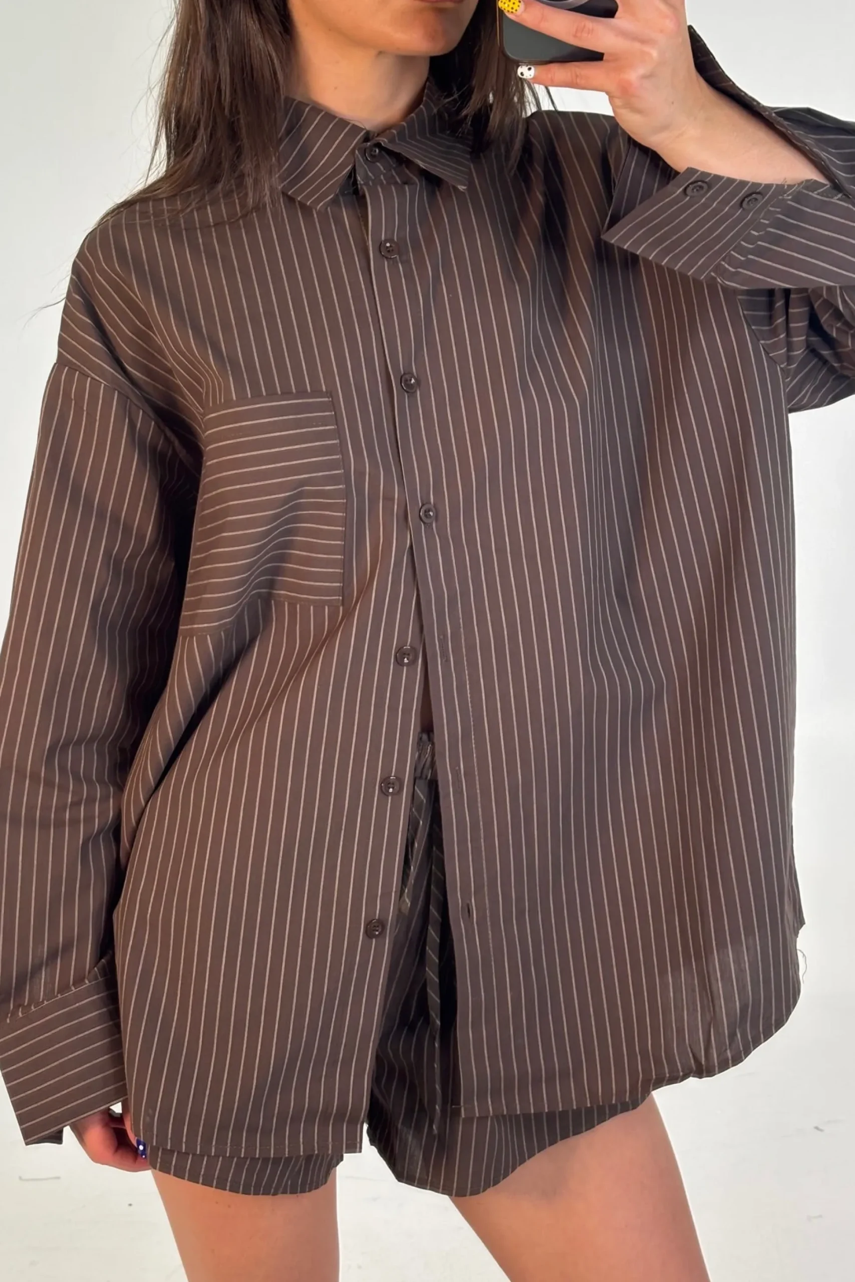 Meet the Wilson Set, Effortless and relaxed, this striped lounge set is the perfect blend of comfort and style. Featuring an oversized button down shirt with a collared neckline, dropped shoulders, and a front pocket detail, paired with matching relaxed shorts.