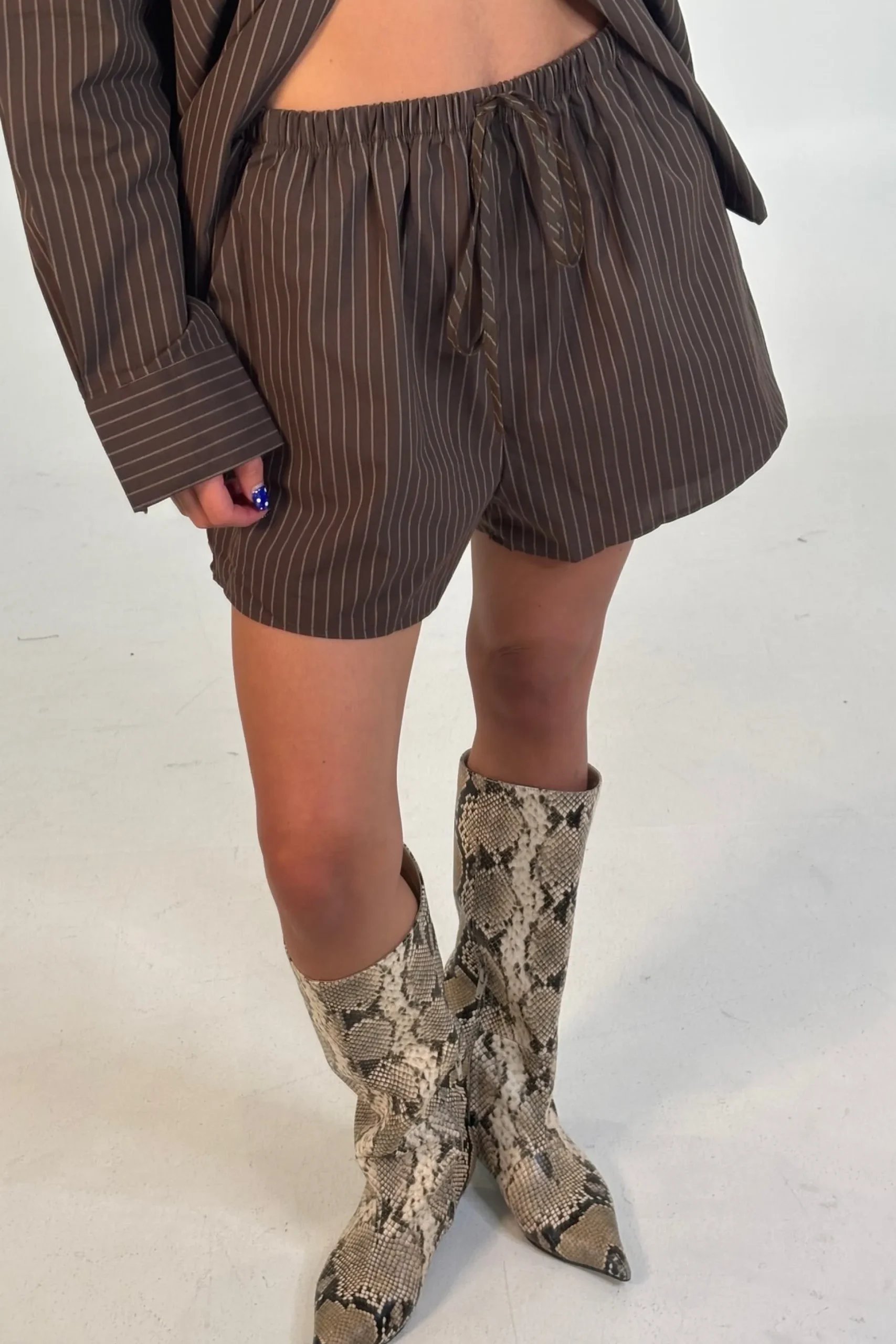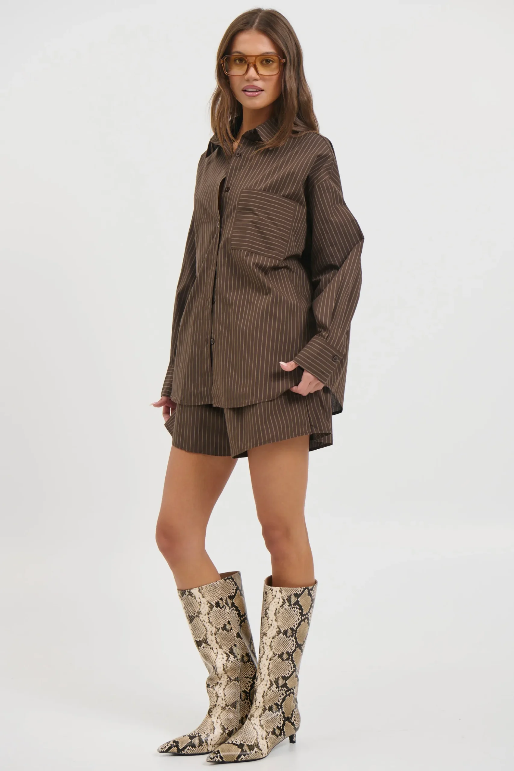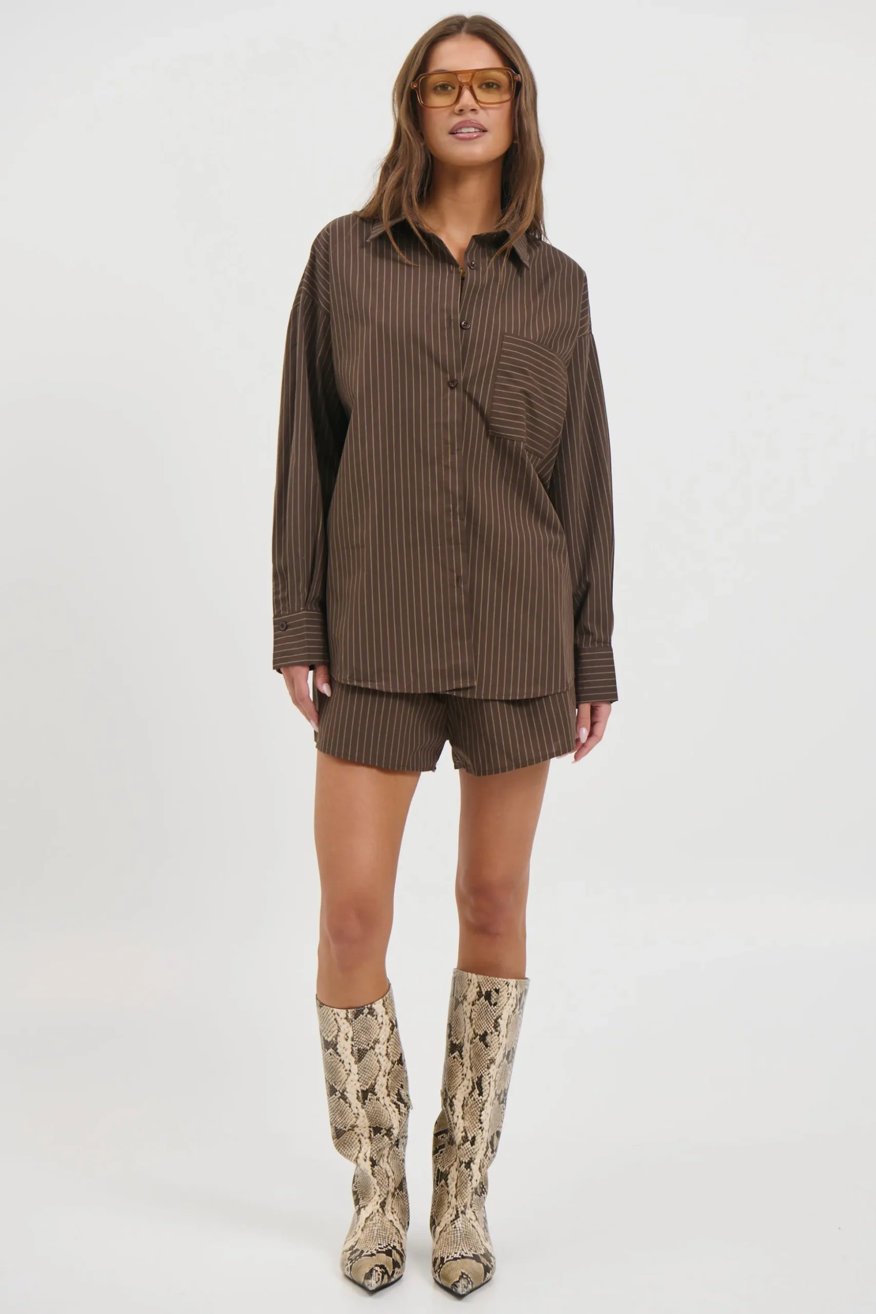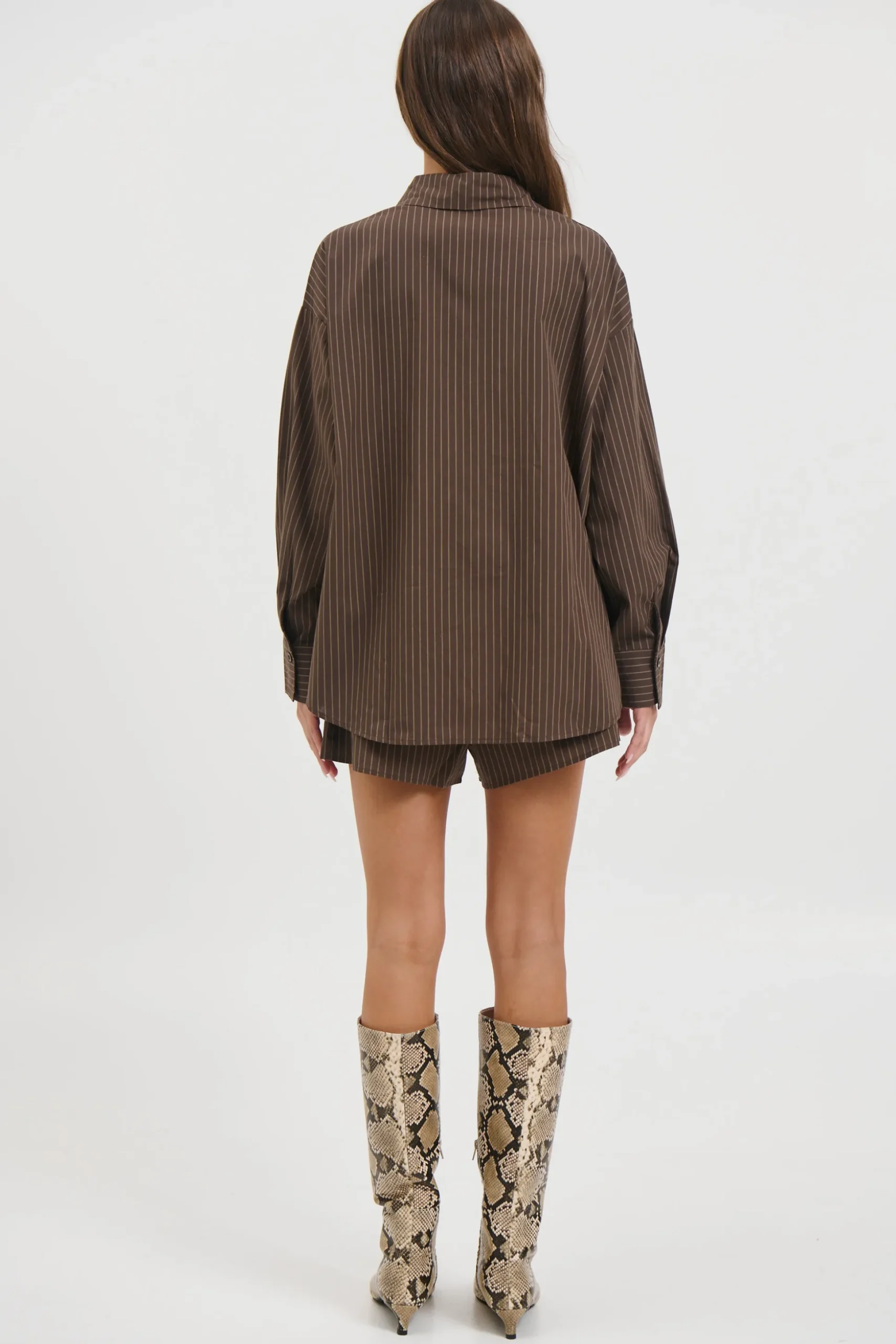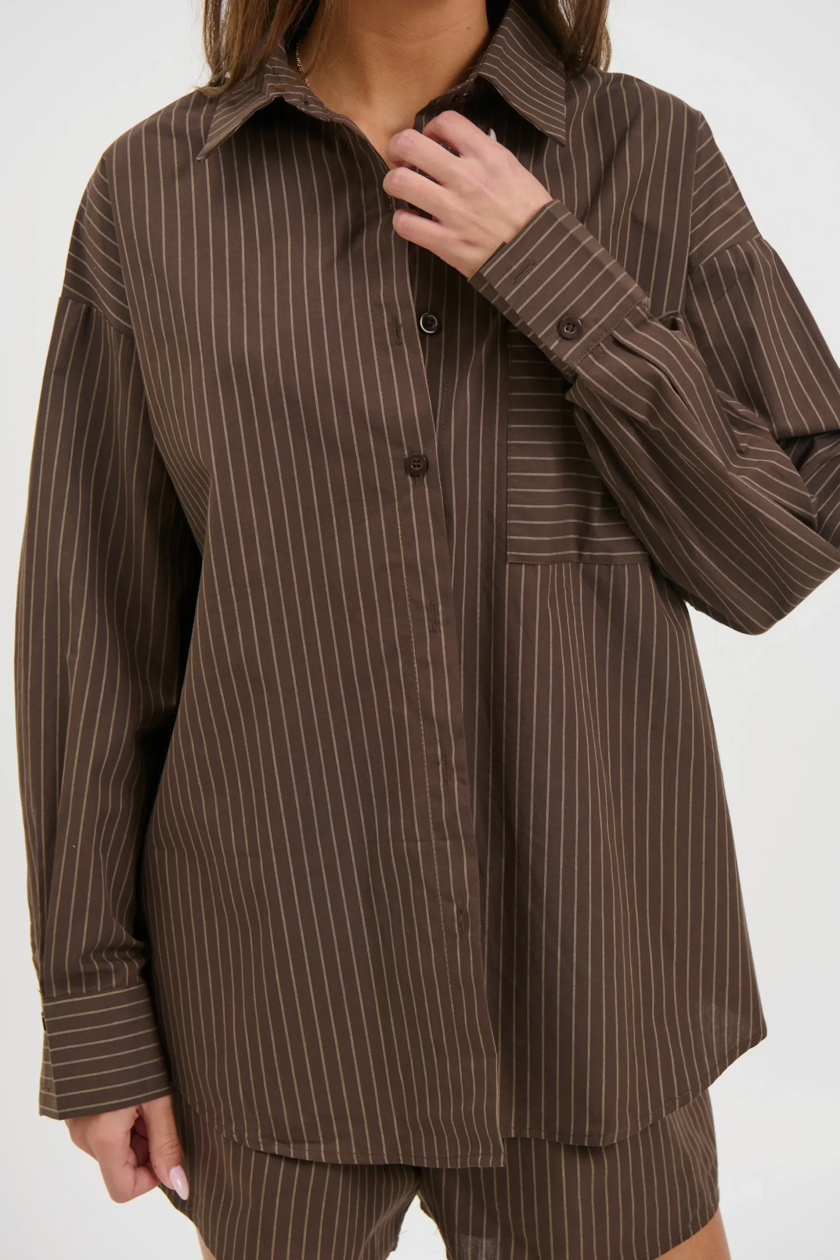 Meet the Wilson Set, Effortless and relaxed, this striped lounge set is the perfect blend of comfort and style. Featuring an oversized button down shirt with a collared neckline, dropped shoulders, and a front pocket detail, paired with matching relaxed shorts.
