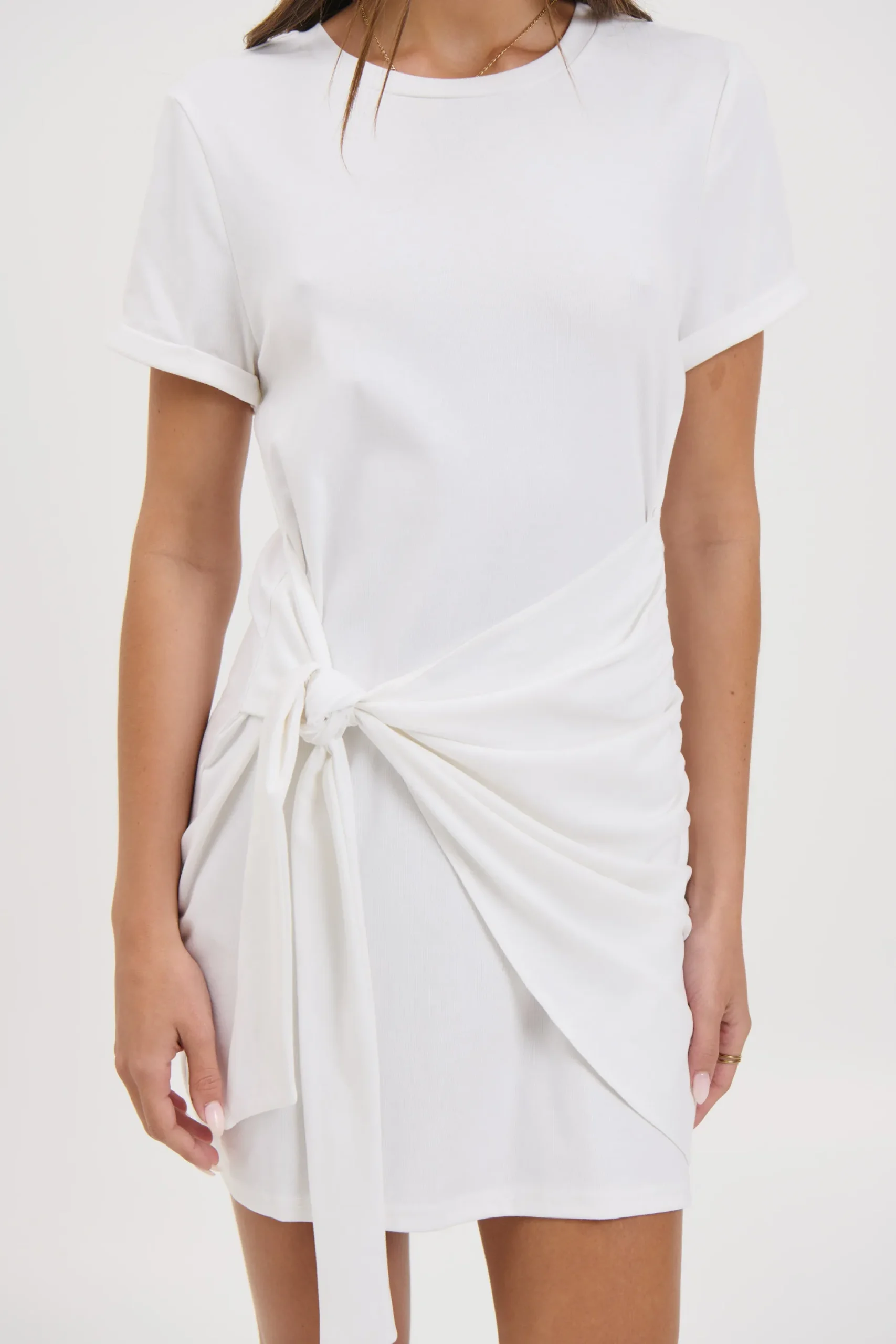 The Winnie Shirt Dress features a mini length, short cuffed sleeves, self-tie detailing at the front, a crew neckline, unlined and slightly sheer under light.