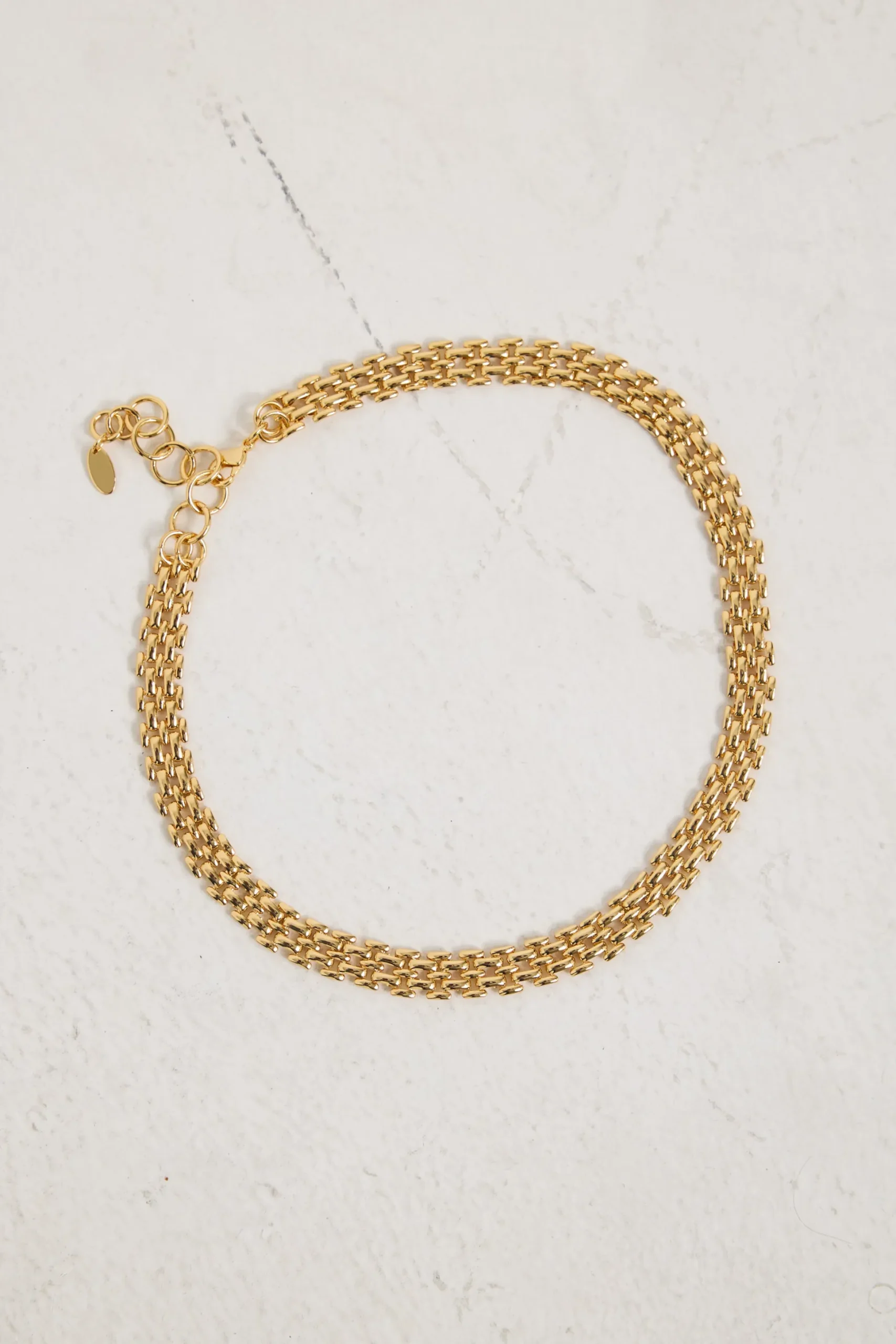 The Popcorn Chain Bracelet, features a bold, interlocking link design that sits elegantly around the wrist.