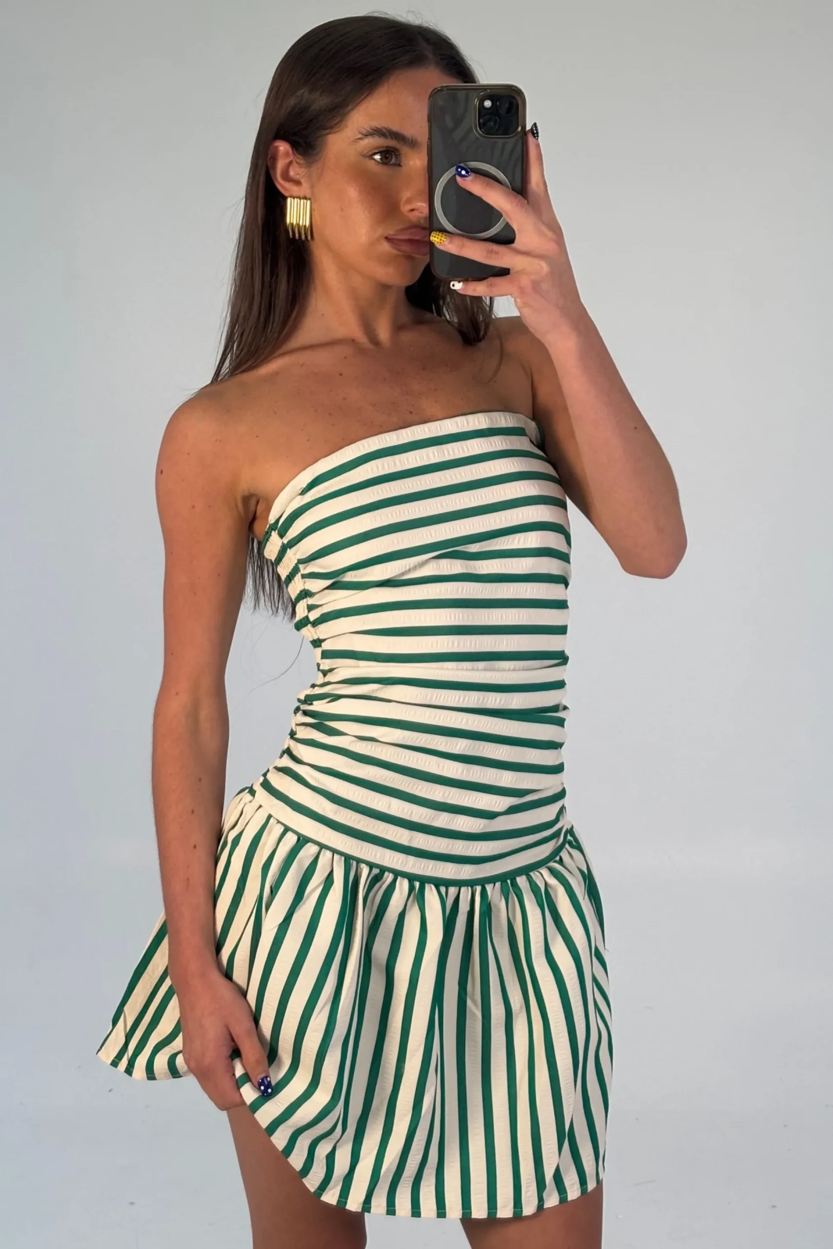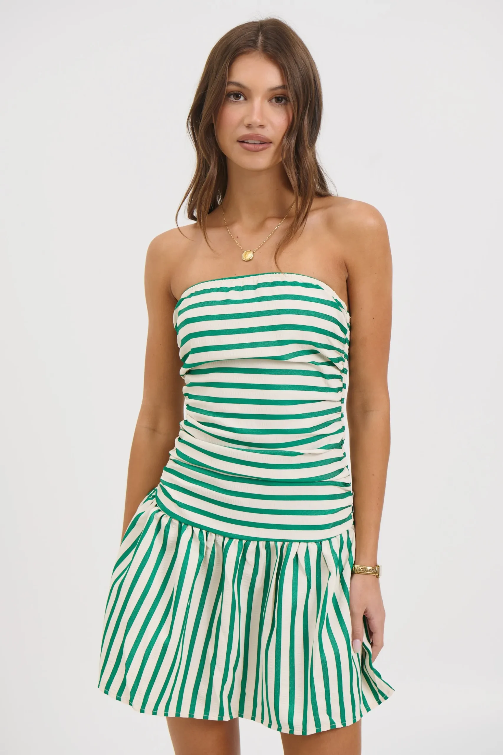 Meet the Zarella Mini Dress, Featuring a strapless design, this dress exudes effortless elegance with its pleated wrap style. The skirt flows gracefully from the hips into an A-line hem, creating a flattering silhouette that moves beautifully with every step.